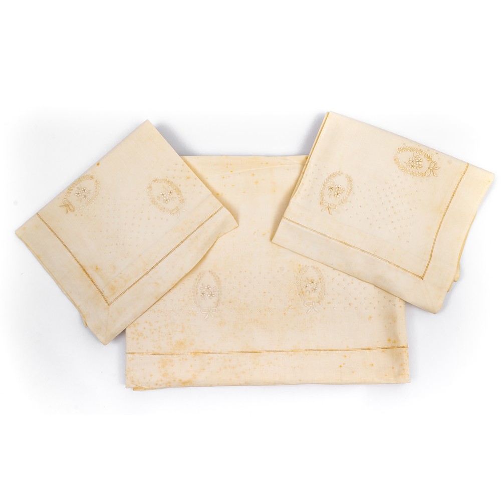 LENZUOLO matrimoniale con due federe in tessuto di lino nei toni del beige con ricami a mano (usure e macchie).