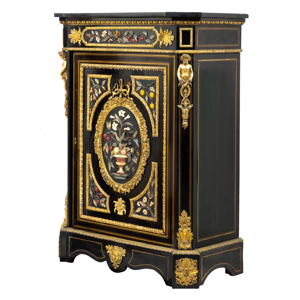 Credenza ad un'anta in legno ebanizzato con tarsie in rame, elementi in bronzo dorato ed applicazioni a rilievo di pietre dure.