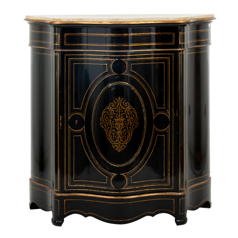 Mobile di epoca Napoleone III ad un'anta, con tre ripiani interni in legno laccato nero con tarsie in rame dorato e piano in marmo bianco di Carrara.
