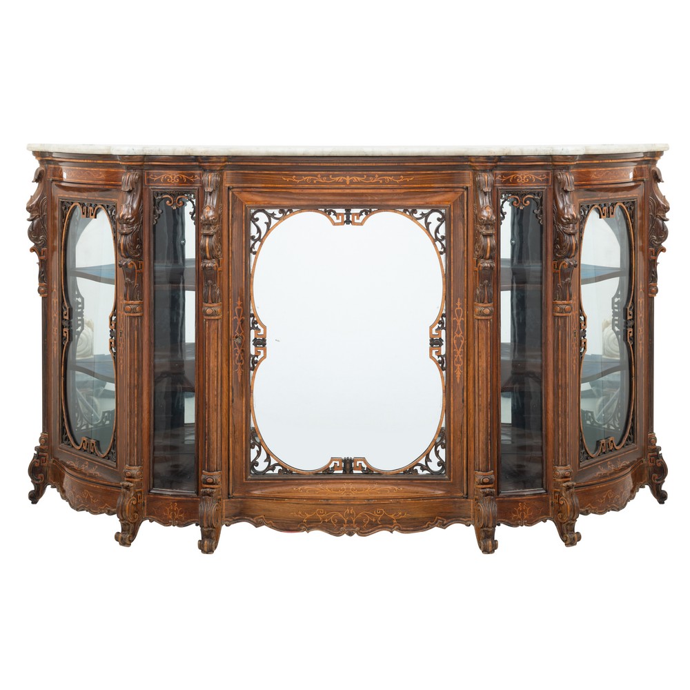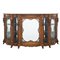 Etagere in legno di noce, esotico e perfili in bosso con tre ante di cui una centrale specchiata e due laterali a vetrina, piano in marmo bianco di Carrara.
