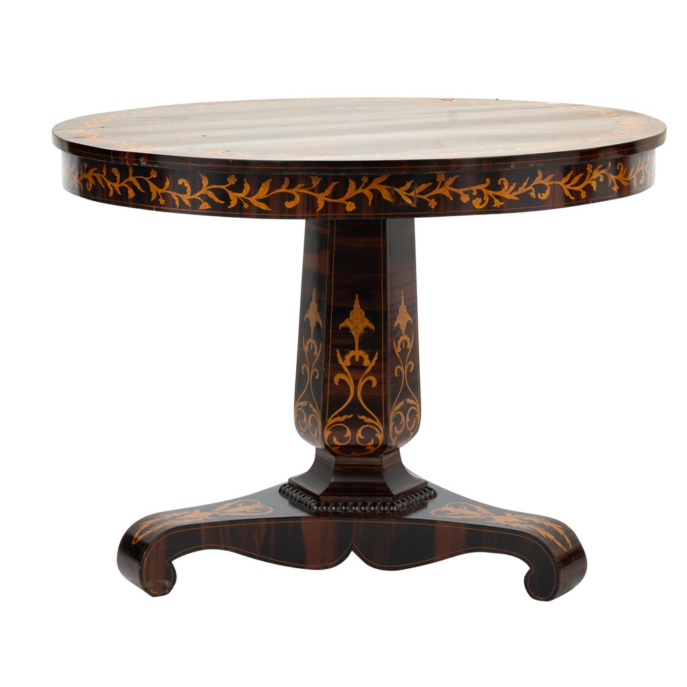 Tavolo Carlo X da centro in piuma di mogano riccamente intarsiato in legno di bosso.