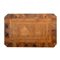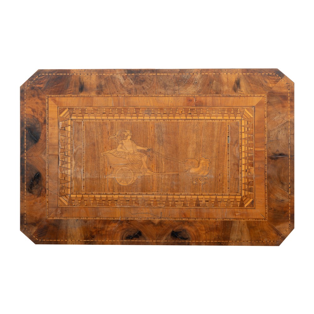 Tavolino di forma rettangolare in legno di noce e tarsie in bosso, intarsio sul piano raffigurante "Biga".