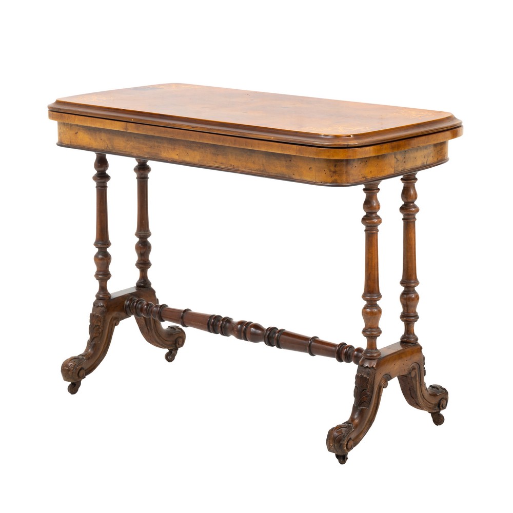 Tavolino da gioco a libro in legno di noce e radica di noce, periodo Vittoriano.