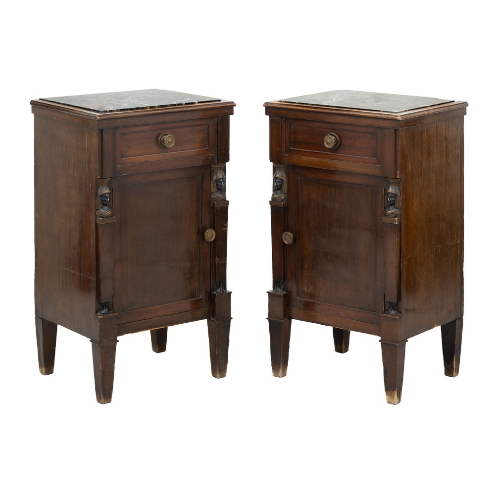 Coppia di comodini Impero in mogano con tre cassetti e due piccoli cassetti, fregi in legno raffiguranti "Sfingi", maniglie in ottone, piano in marmo verde delle alpi incassato.