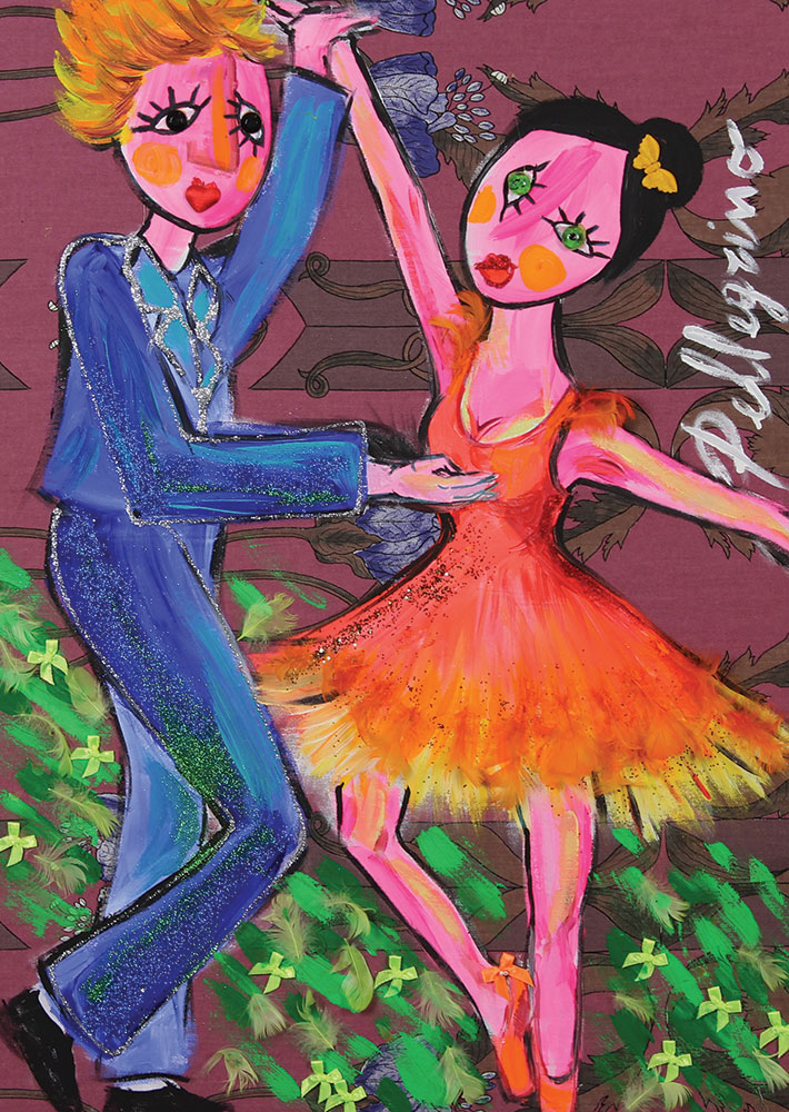 Pellegrino Federica Passo a due tecnica mista e materiali vari su broccato applicato su tavola, cm. 70x50 firmato in alto a destra, firmato ed intitolato al retro, autentica dell'artista su foto