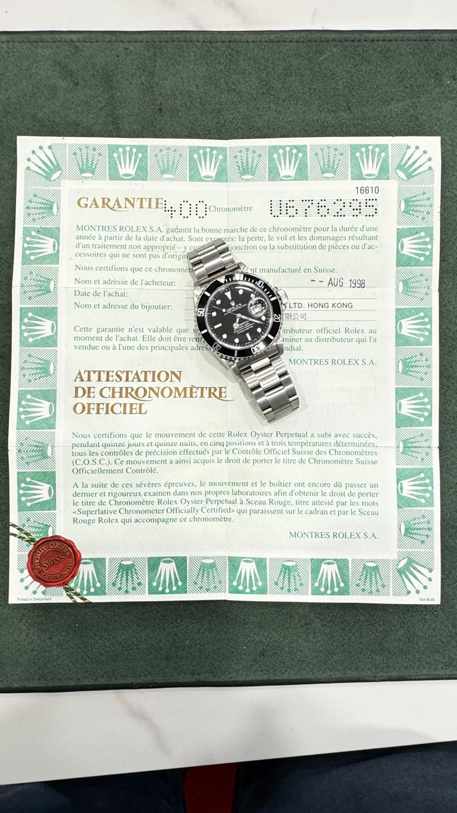 Marca Rolex Modello (Orologio) Submariner Date Numero di referenza 16610 Carica Automatico Materiale della cassa Acciaio Materiale cinturino Acciaio Anni 90 Corredo documenti originali, no box la scatola è utilizzata solo per fotografie non in vendita Materiale della cassa Acciaio Diametro 40 mm Impermeabile 30 ATM Materiale lunetta Acciaio Vetro Vetro zaffiro Numeri sul quadrante Senza numeri Cinturino Materiale cinturino Acciaio Colore cinturino Acciaio Chiusura Déployante Materiale chiusura Acciaio