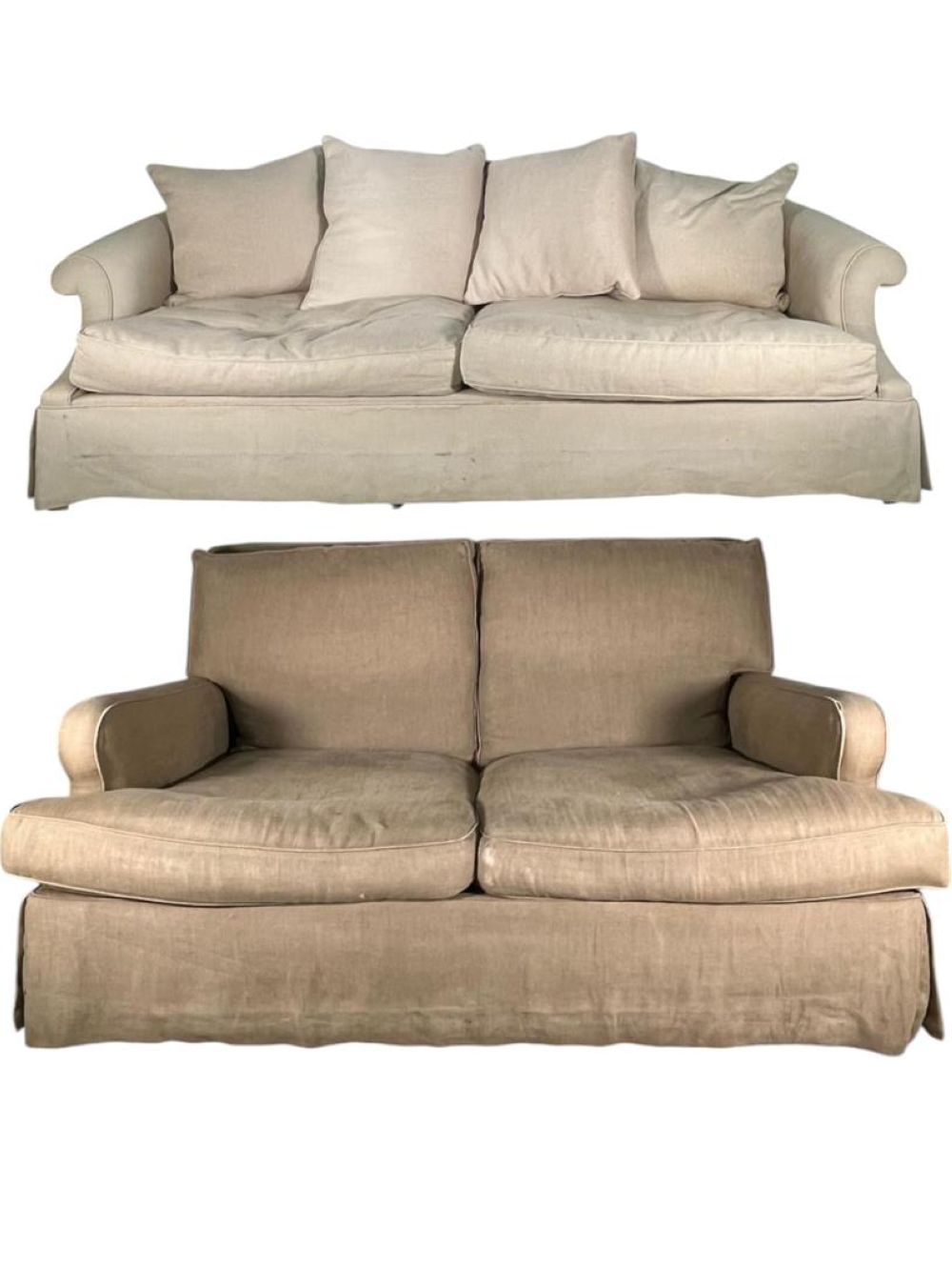 A lot consisting of two lounge sofas upholstered in taupe and white linen fabric respectively.