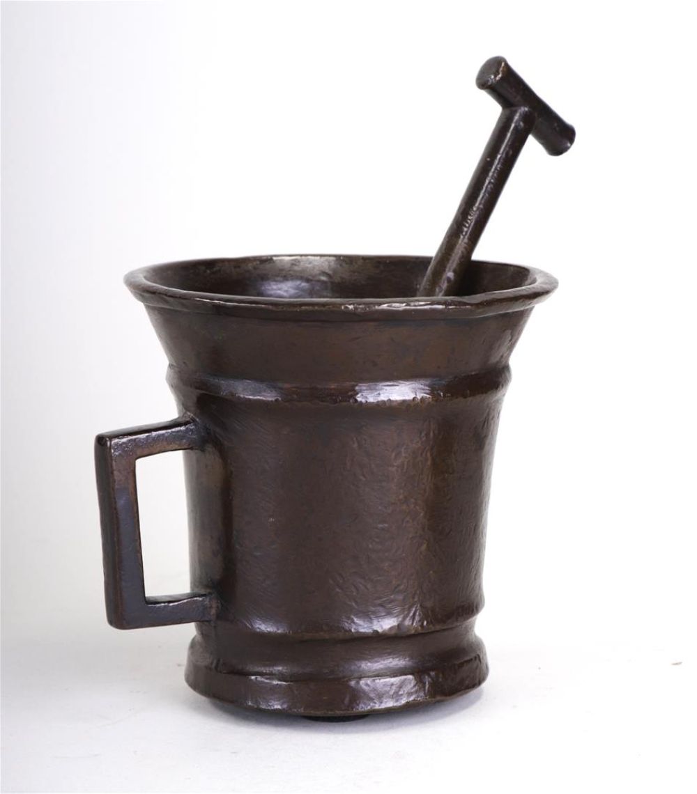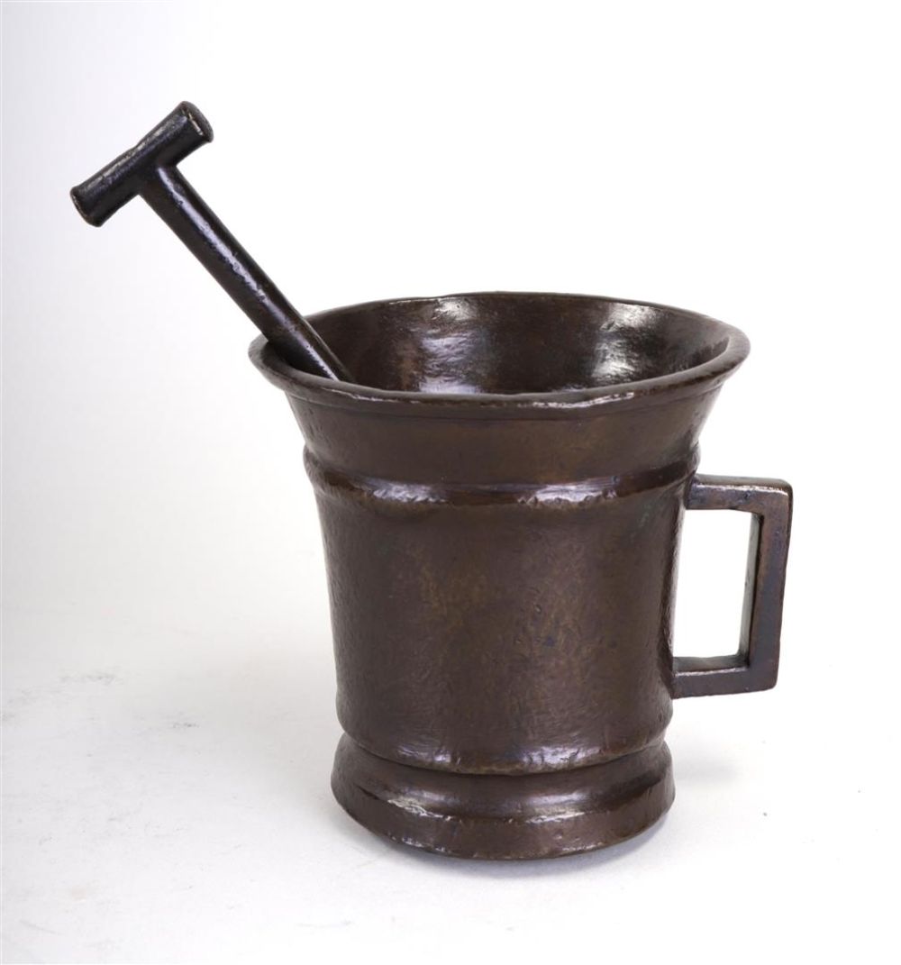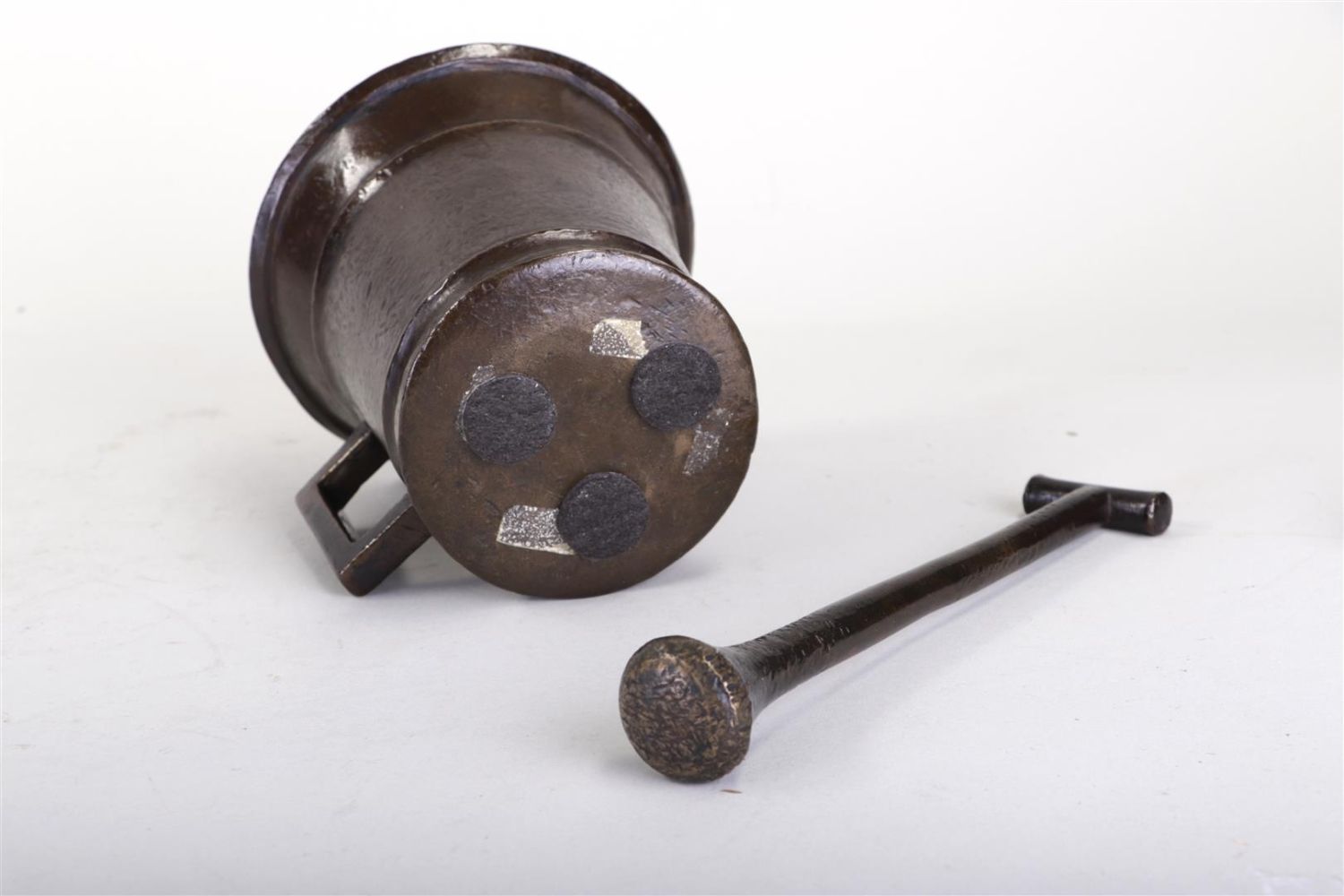 A beautifully patinated Gothic bronze mortar and pestleH.: 13 x diam. 12 cm.