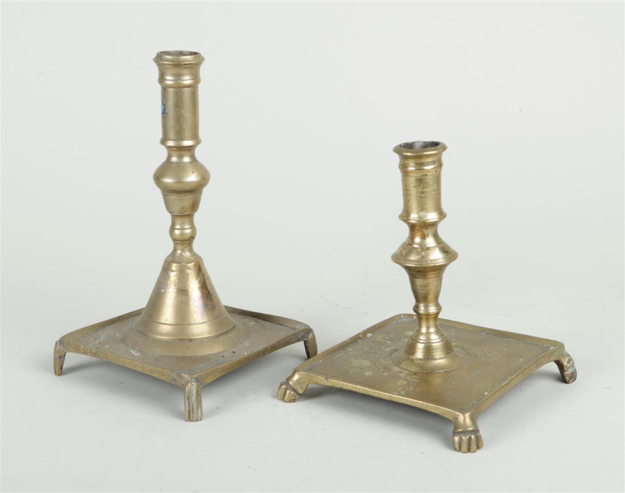 A lot of two Spanish brass candlesticks on a square base and legs, 17th/18th century.