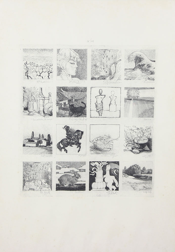 AA.VV. Senza titolo serie di 16 incisioni su un unico foglio di carta, cm. 70x50 (lastra cm. 41x36), es. 25/99 firmate in basso a destra sotto ogni singola incisione, sono presenti macchie di umidità