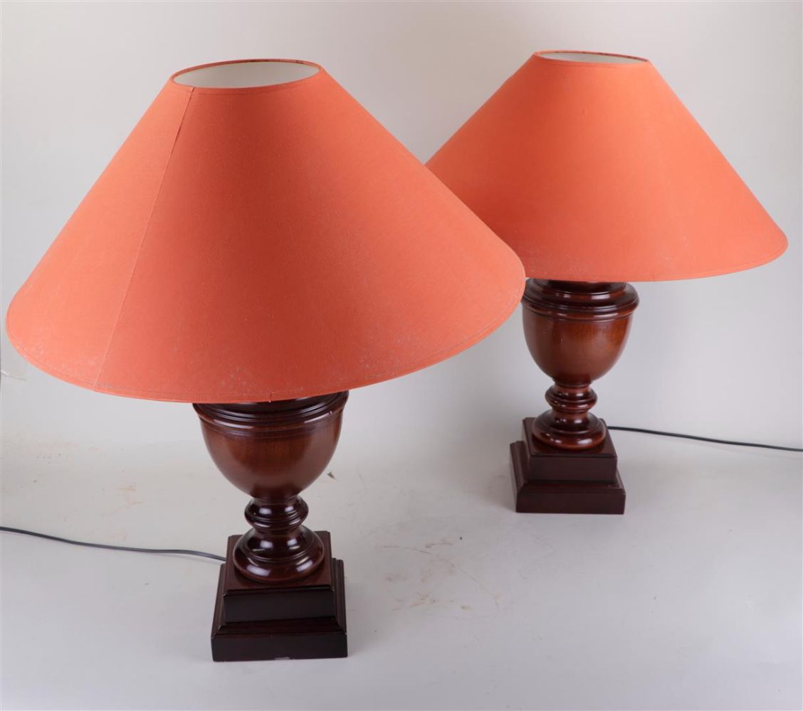 A set of (2) solid mahogany urn-shaped table lamps with red shade. Height: 70 and 65 cm respectively. including shade.