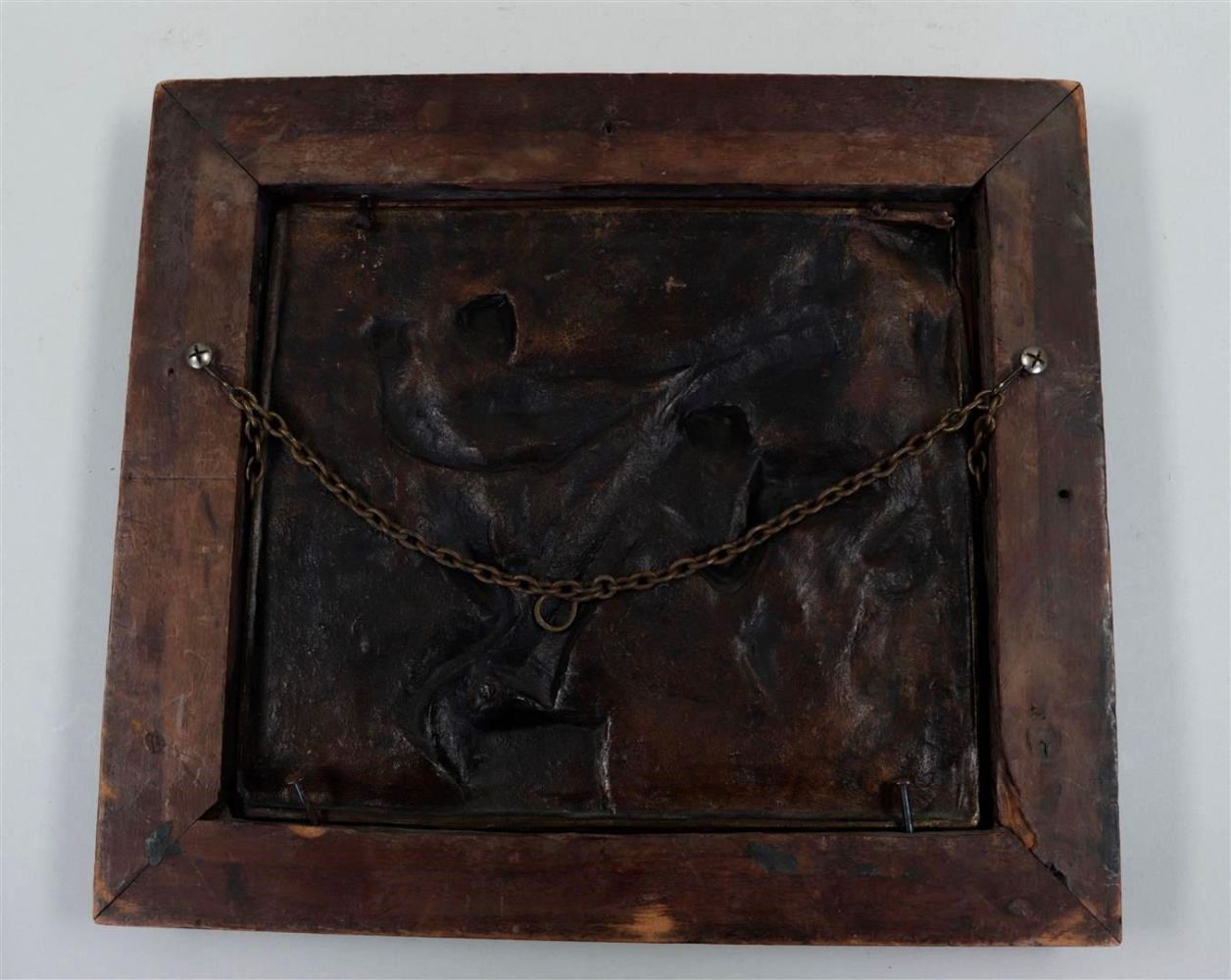 A bronze plaque of a group of nymphs and satyrs raising a bust. France, 19th century.