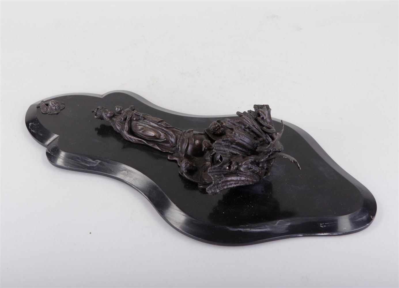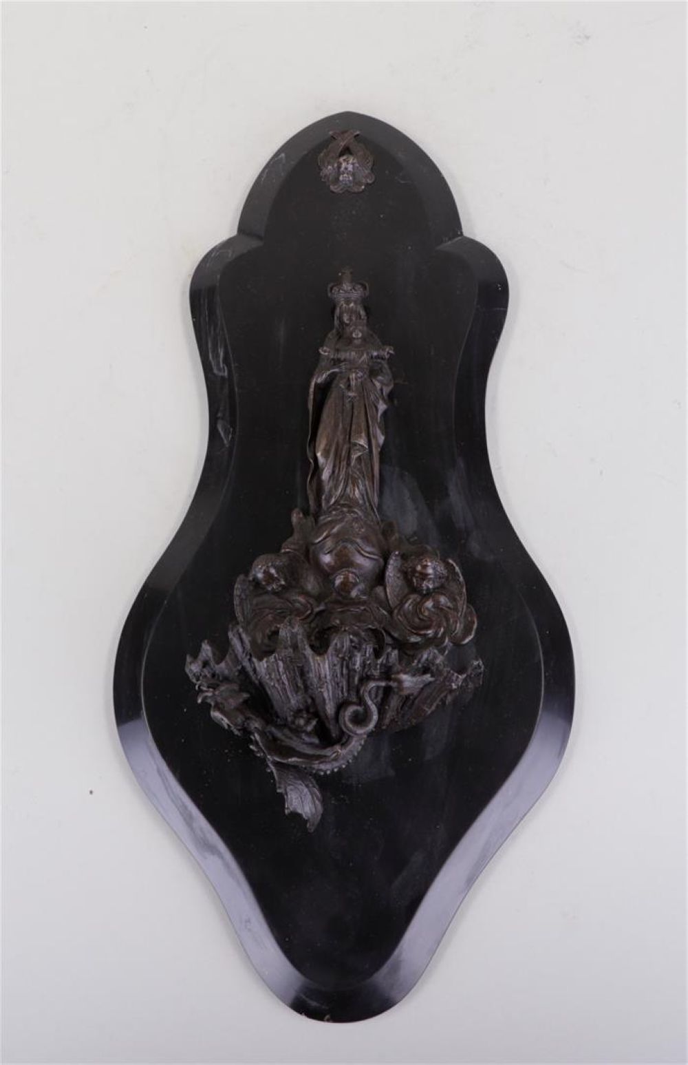 A bronze holy water font above which is the Virgin Mary with Christ Child. ca. 1880.