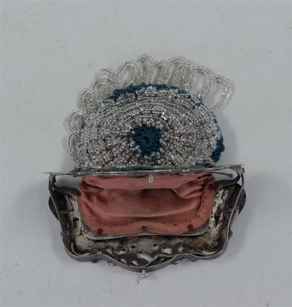 A silver purse with strung beads, accompanied by a pair of silver cufflinks...