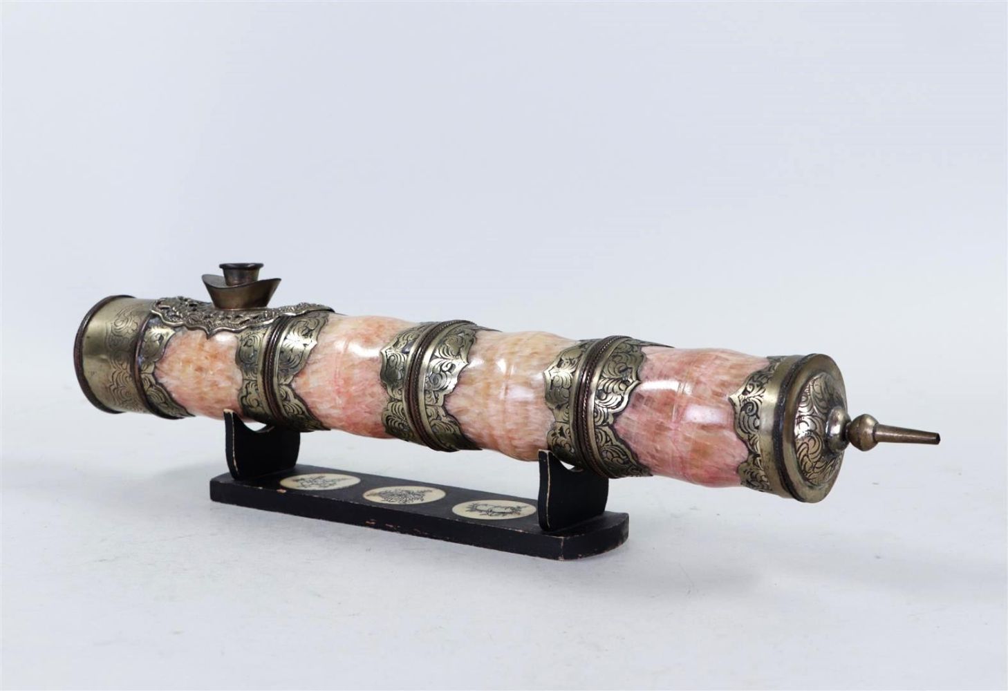 Lotto 1361 | A jade and brass opium pipe on a wooden bone-glued stand.L. 41 cm.