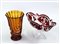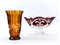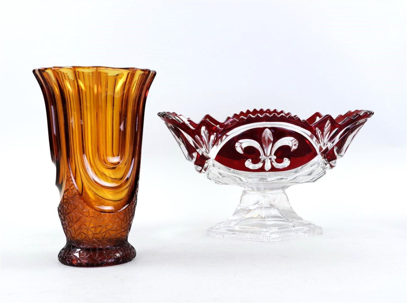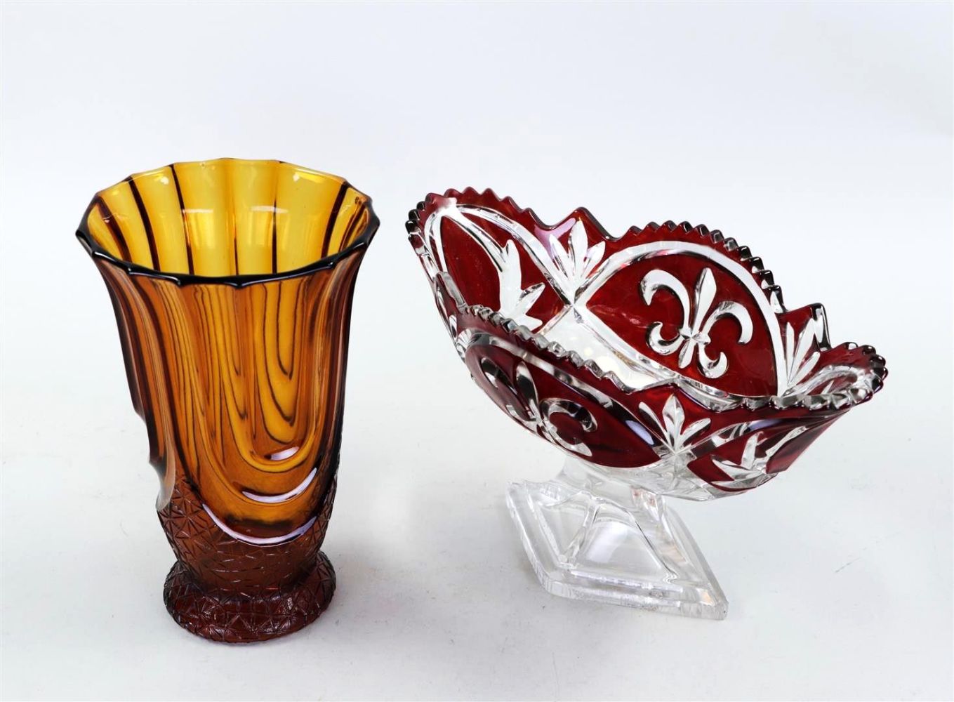 A lot consisting of a pressed glass cranberry centerpiece and an amber-colored vase.