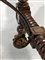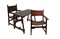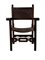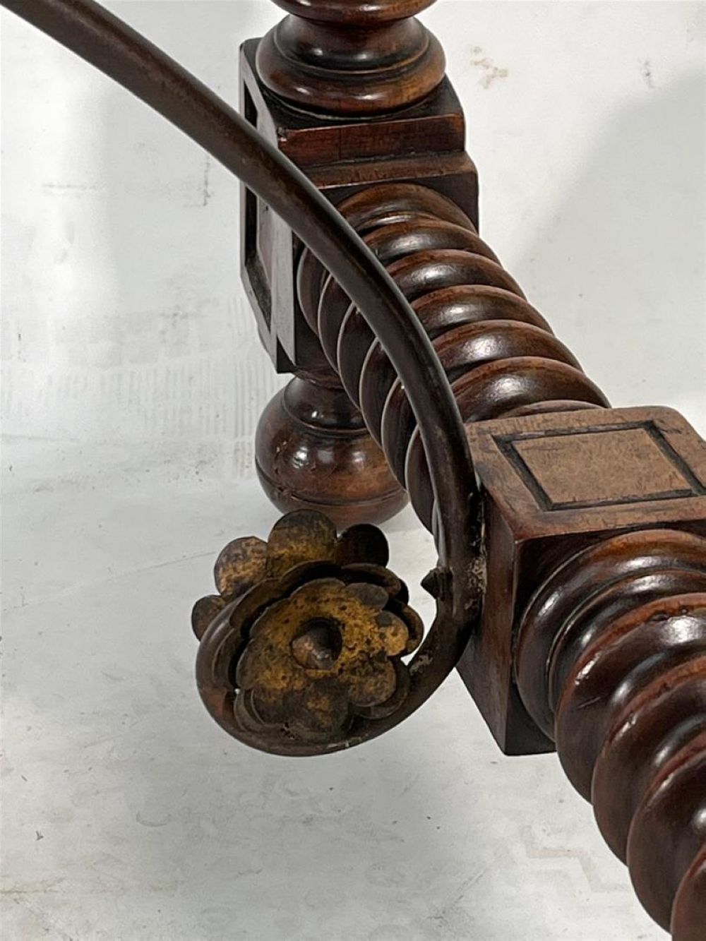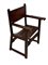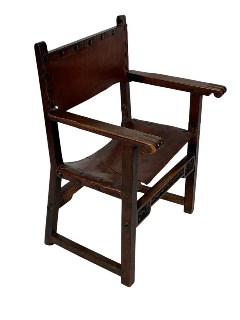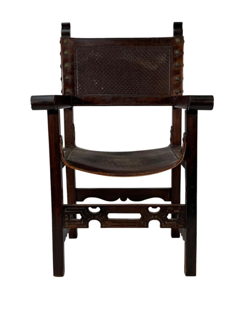 Ern leather upholstered Spanish payment table with matching chair. Also a so-called Spanish chair. (seat torn). Table: 115 x 65 x 80 cm. Chair: H. back: 112 cm. x H.: seat 48 cm. x width: 69 cm. The second chair is smaller.