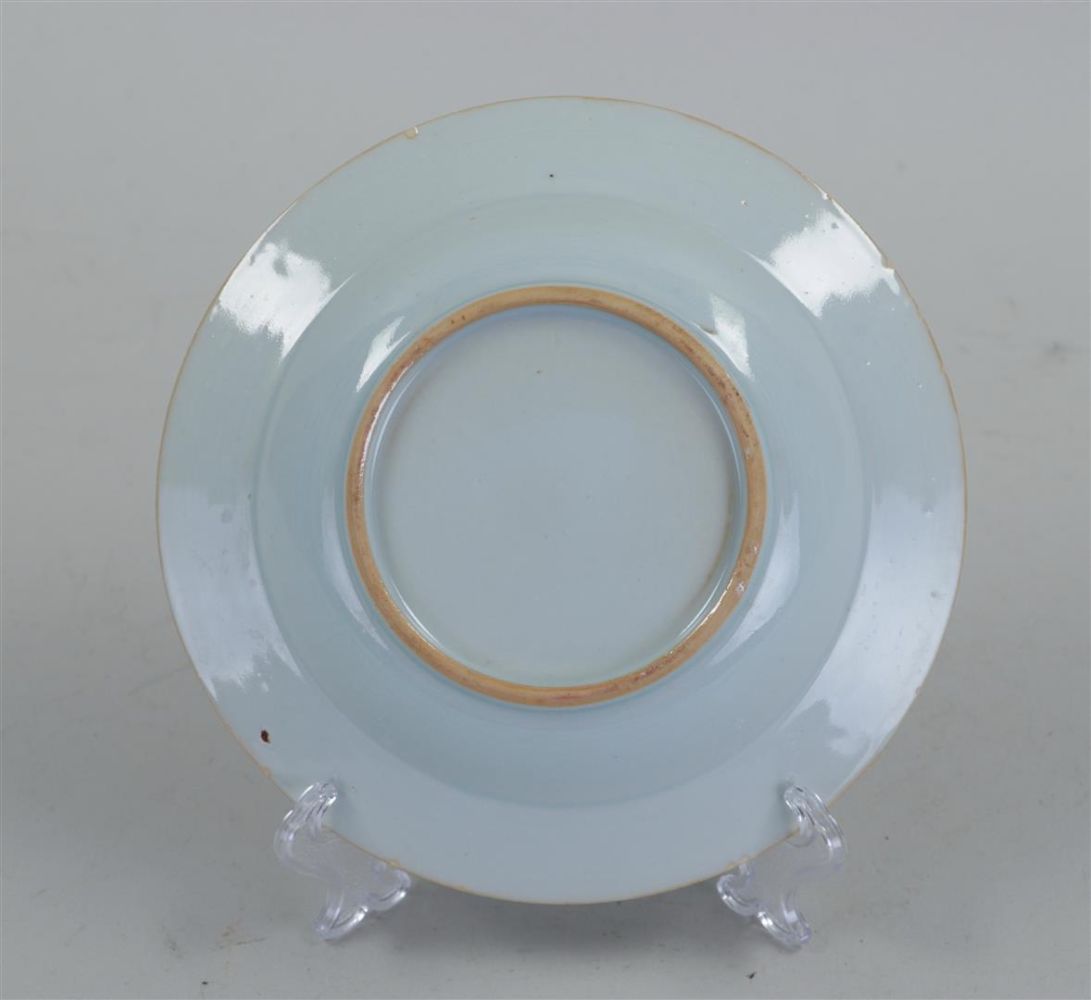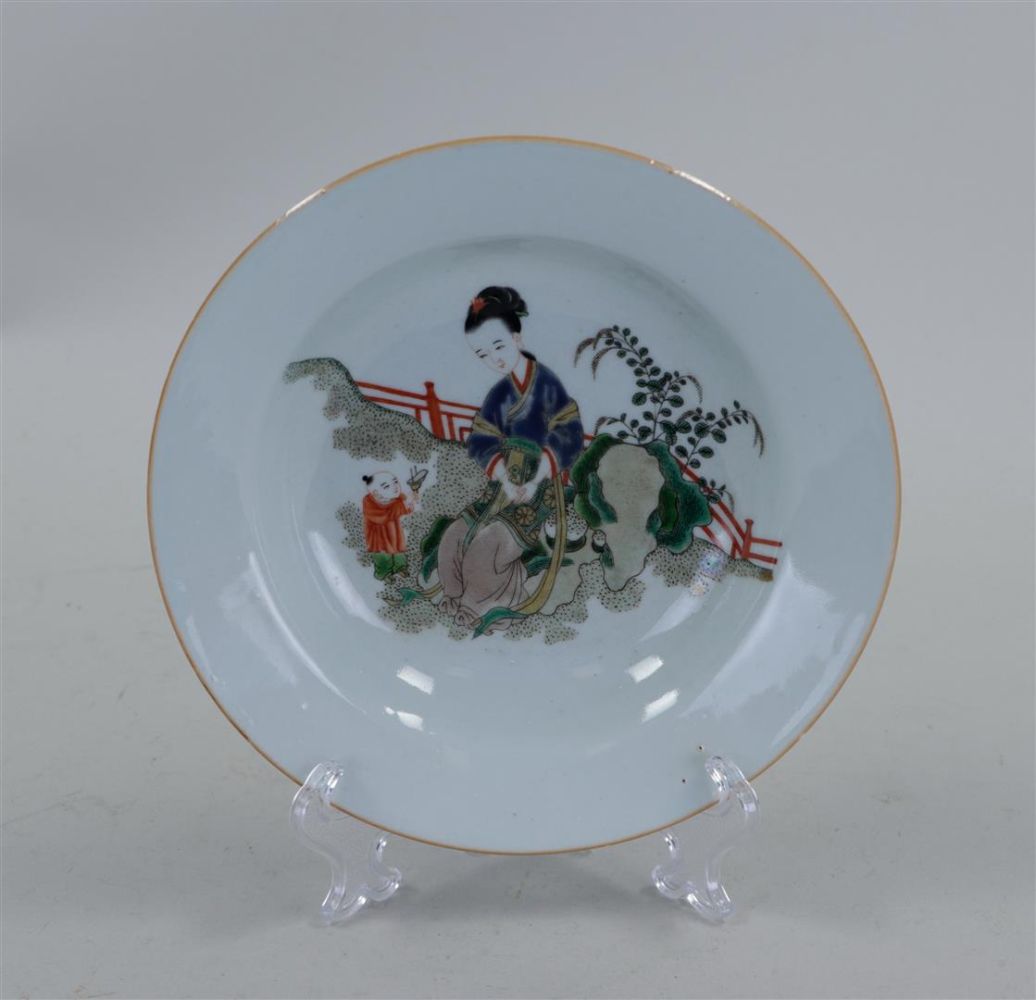 A porcelain famile verte plate decorated with a frame and child. China, 19th century.