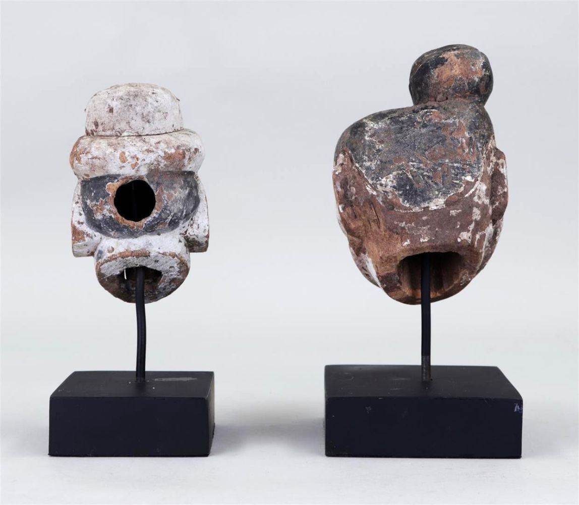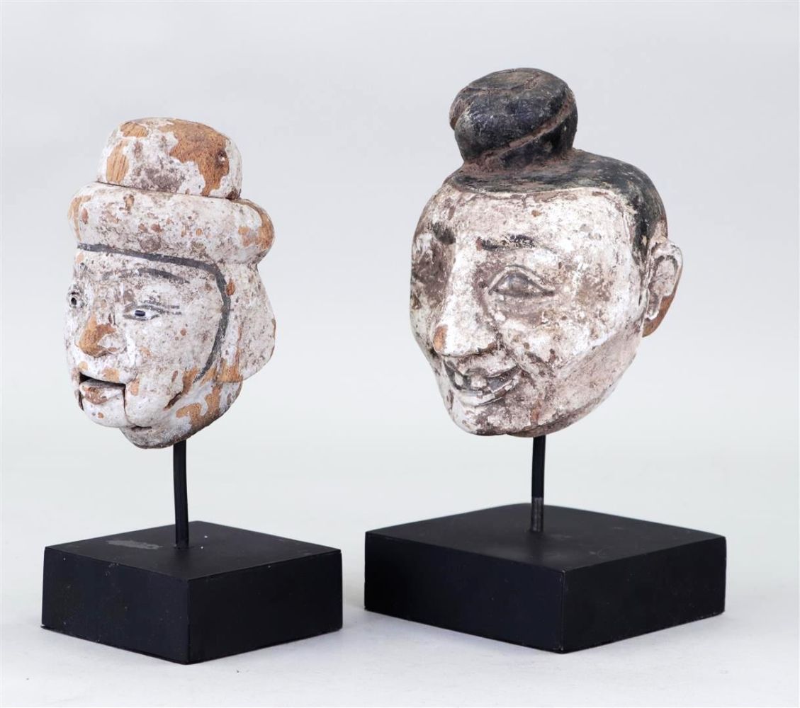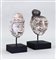 A lot consisting of a polychrome Burmese doll head with movable mouth and glass eyes, and a Japanese (?) doll head with open mouth. South East Asia, 19th century.