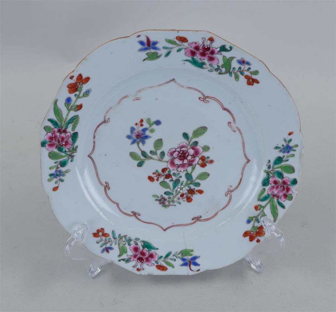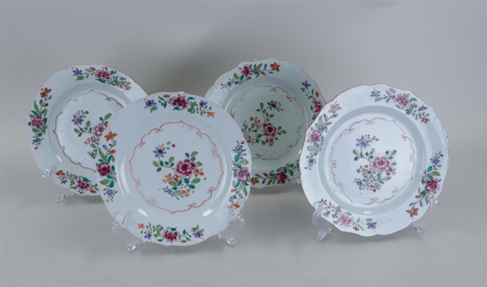 A set of four porcelain famille rose plates with floral decoration. China, 18th century. Chips and hairlines.
