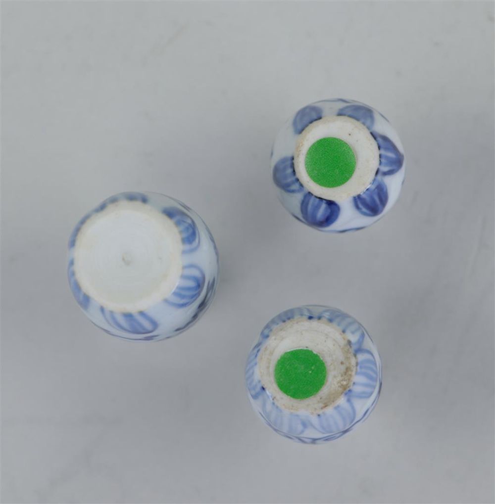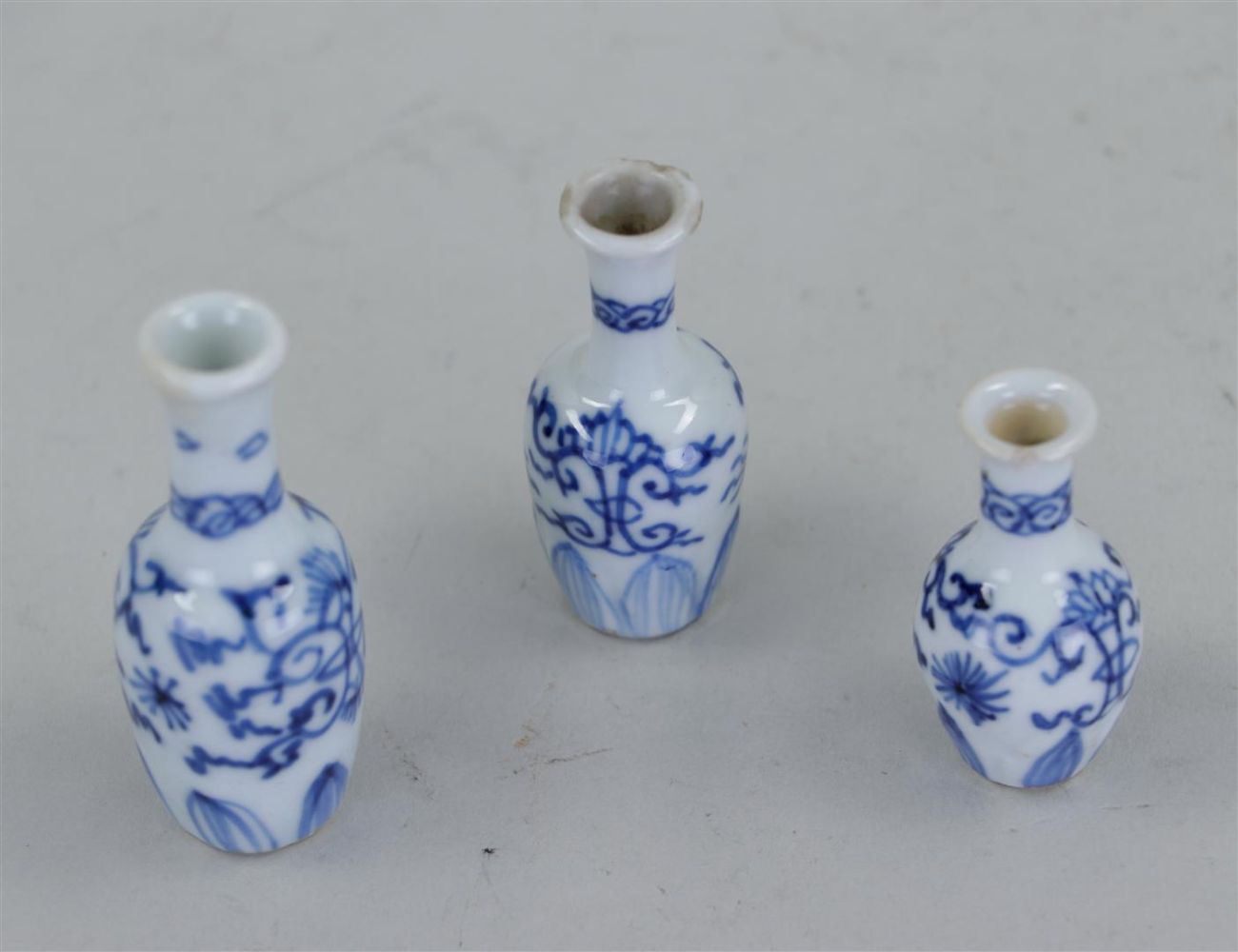 Three porcelain dollhouse vases with lotus flower decoration China, Kangxi ca 1700. Edge damage.