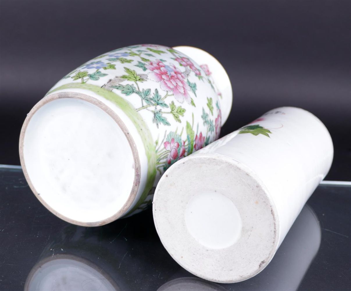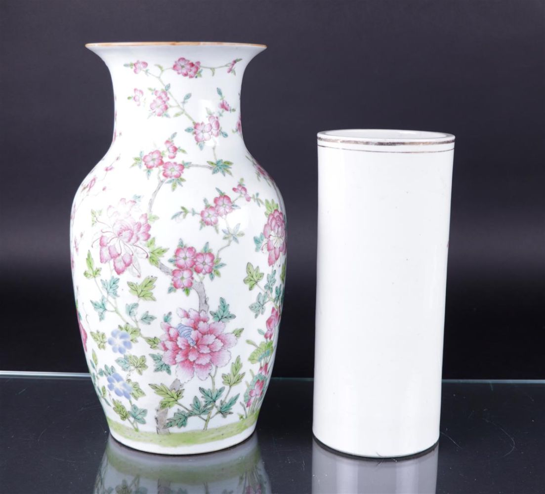 A lot consisting of a baluster vase with floral decor and a brush pot with a decor of birds, flowers and characters. China, 19th century,