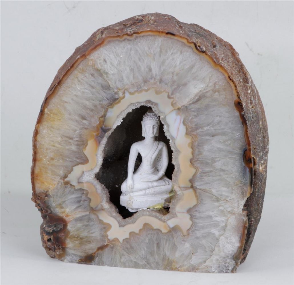 A large agate stone with a Buddha statue incorporated into it.27 x 26 x 17 cm.