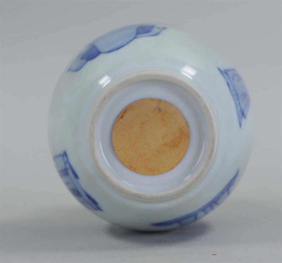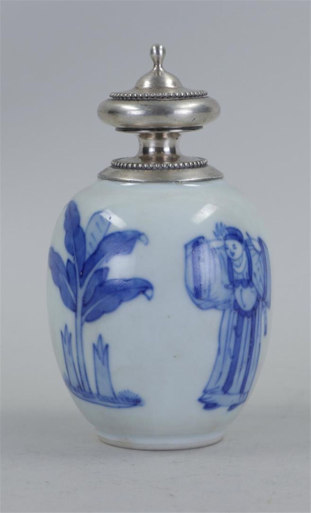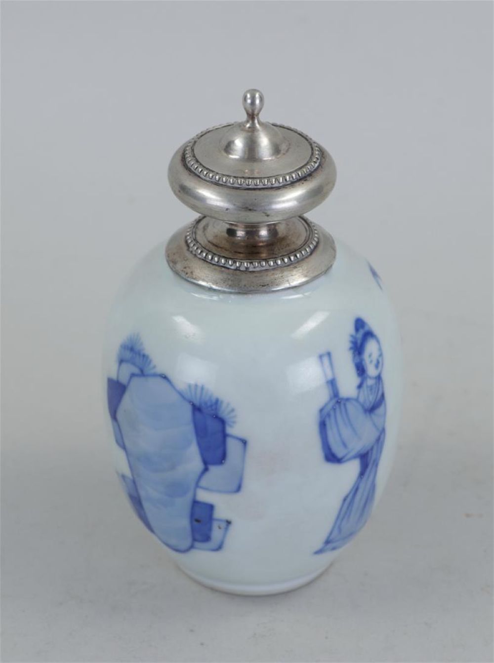 Lotto 2117 | A porcelain tea caddy decorated with figures and a glued silver-plated cap....