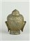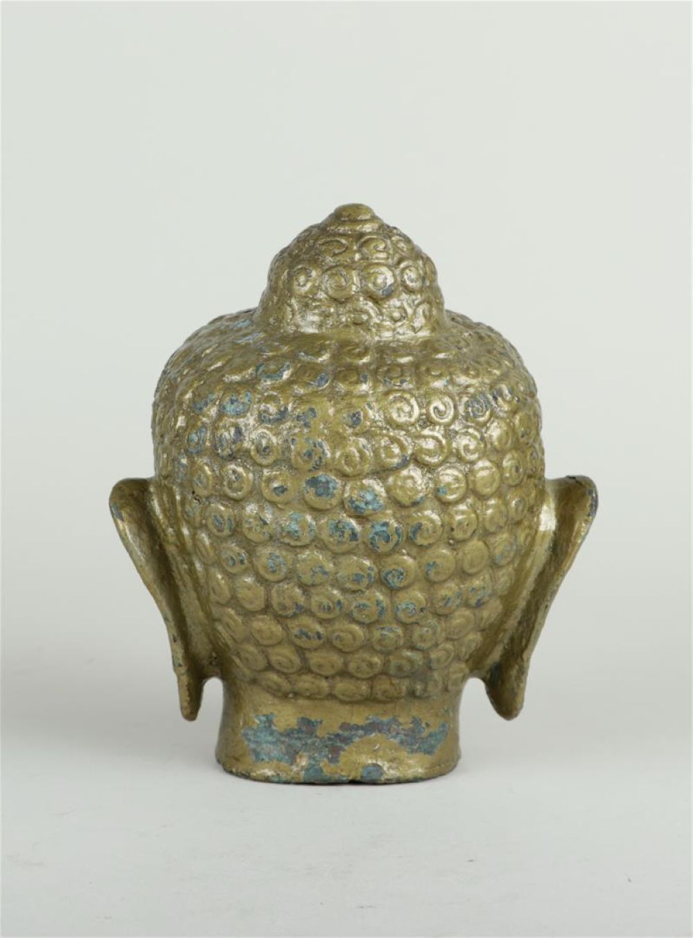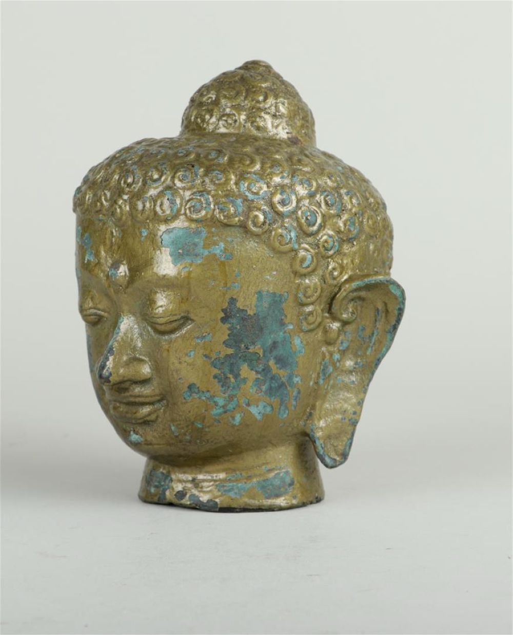 A bronze gold painted Buddha head. Probably Cambodia, circa 1900.16,5 x 15 cm.