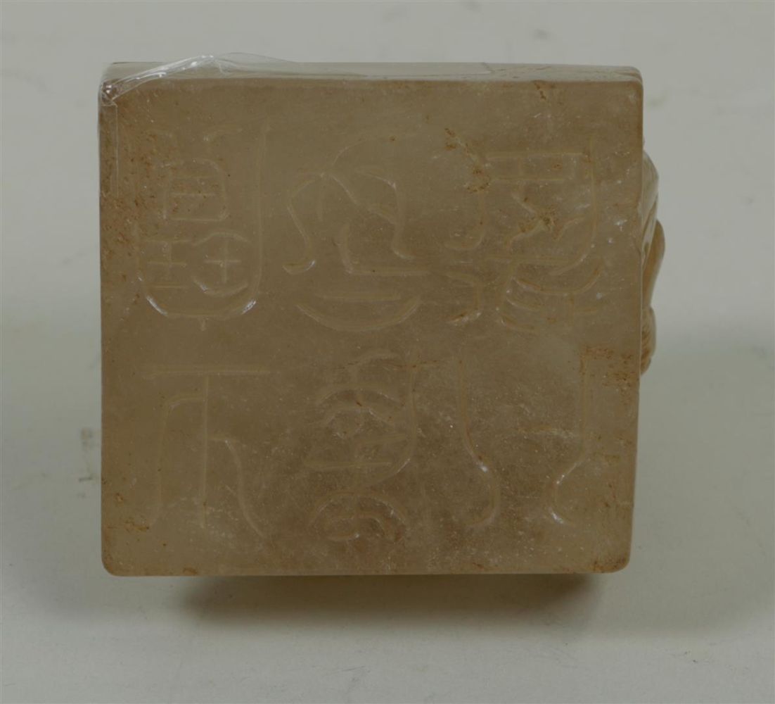 A smoky quartz/rock crystal cutout of a mythical creature attacked by dogs,