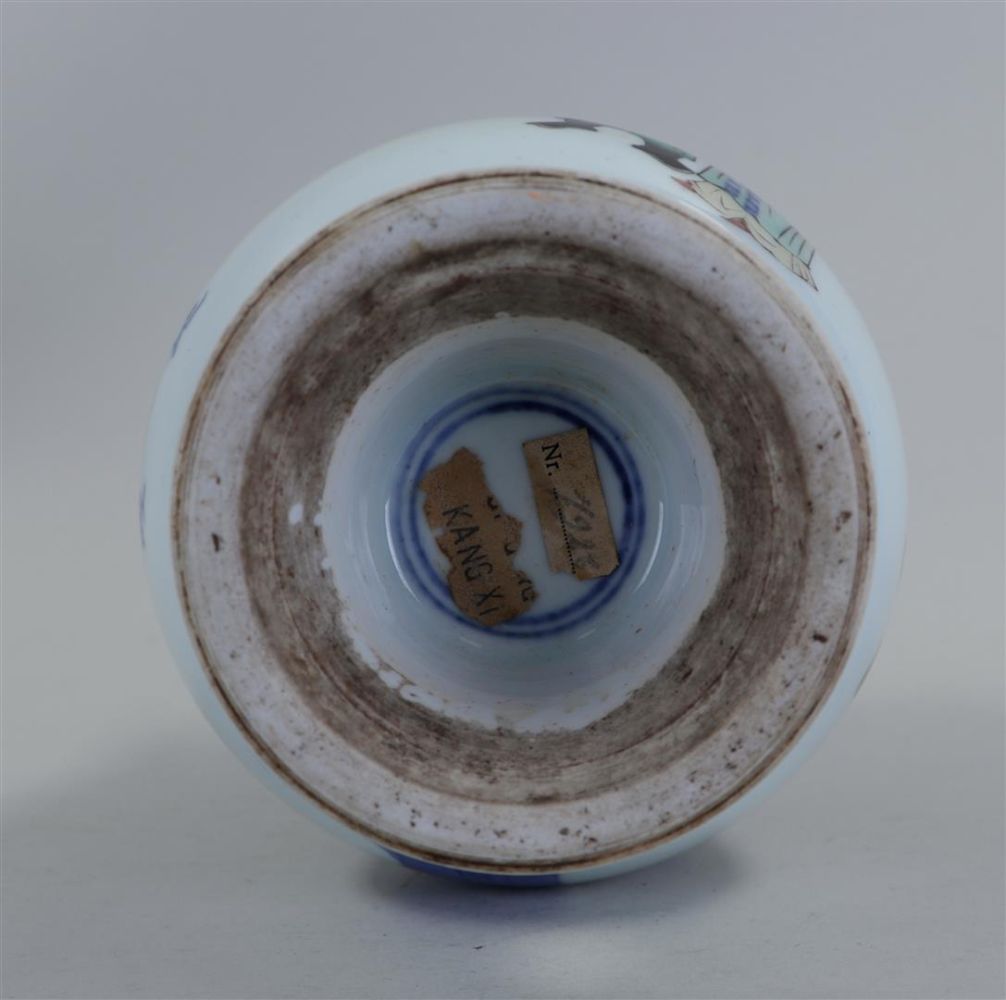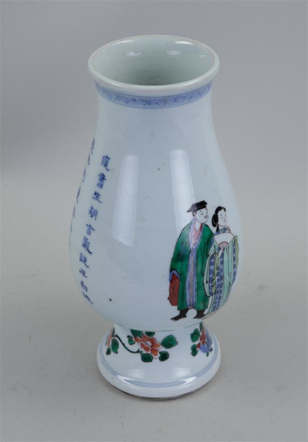 A porcelain wucai vase with decoration of figures and Chinese characters on the back. China, Kangxi.