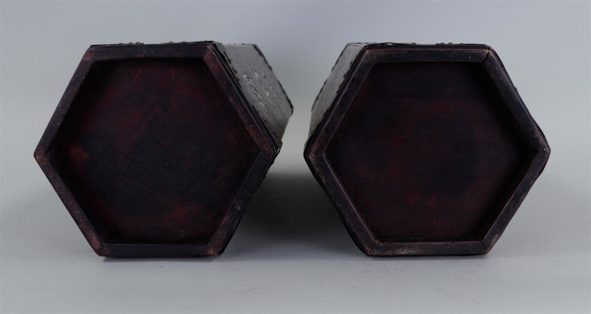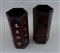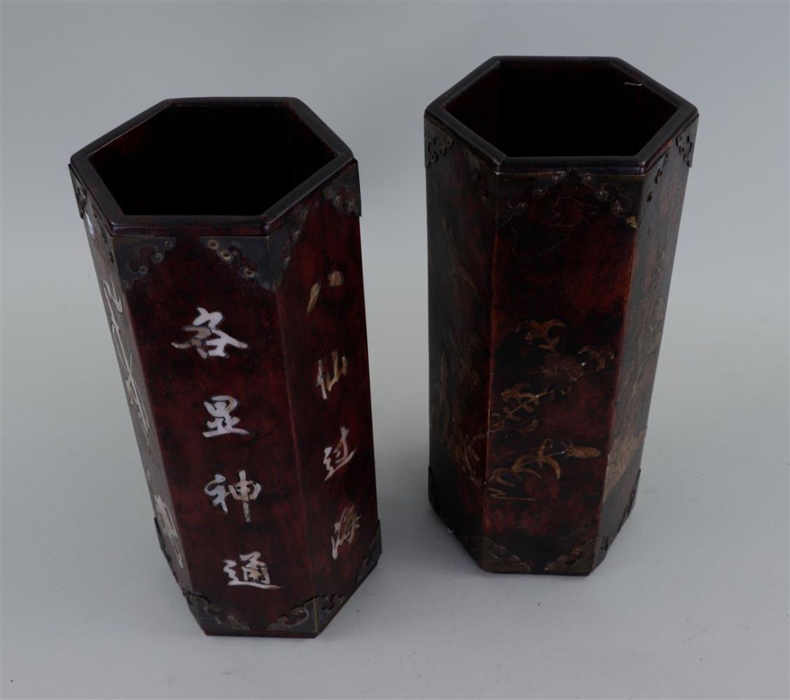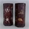 A set of two large wooden brush cups decorated with characters and landscape in mother of pearl. China, 19/20th century.