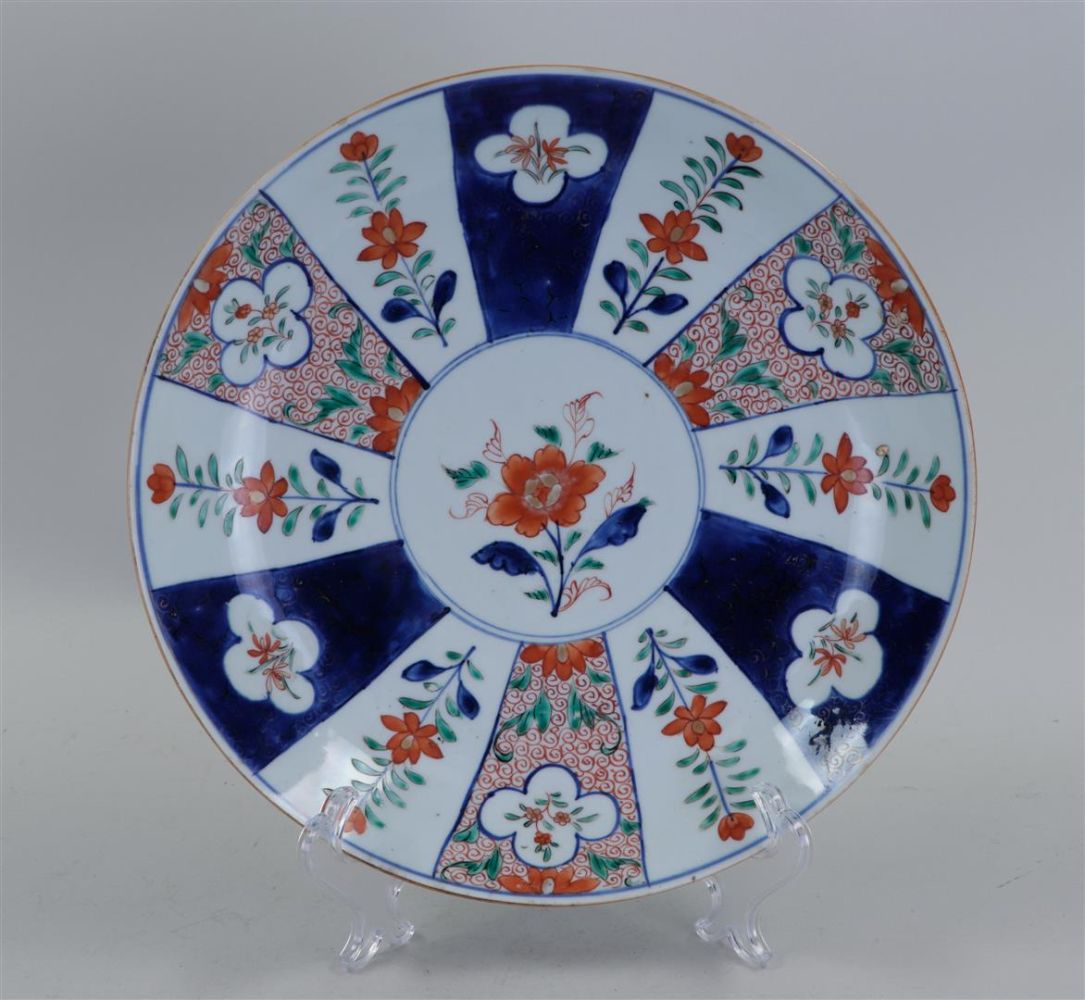 A large porcelain Imari dish with floral decoration in borders. China, 18th...