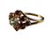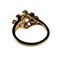 Diamonds: Central stone J/K SI, Color difficult to determine due to yellow setting. The surrounding brilliants are in the color fancy dark cognac (brown with yellow undertone.) Fluorescence; 1 small brilliant shows weak fluorescence and 1 shows moderate fluorescence.