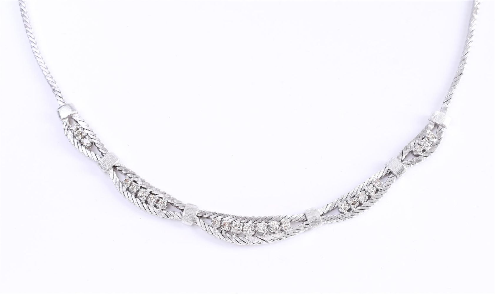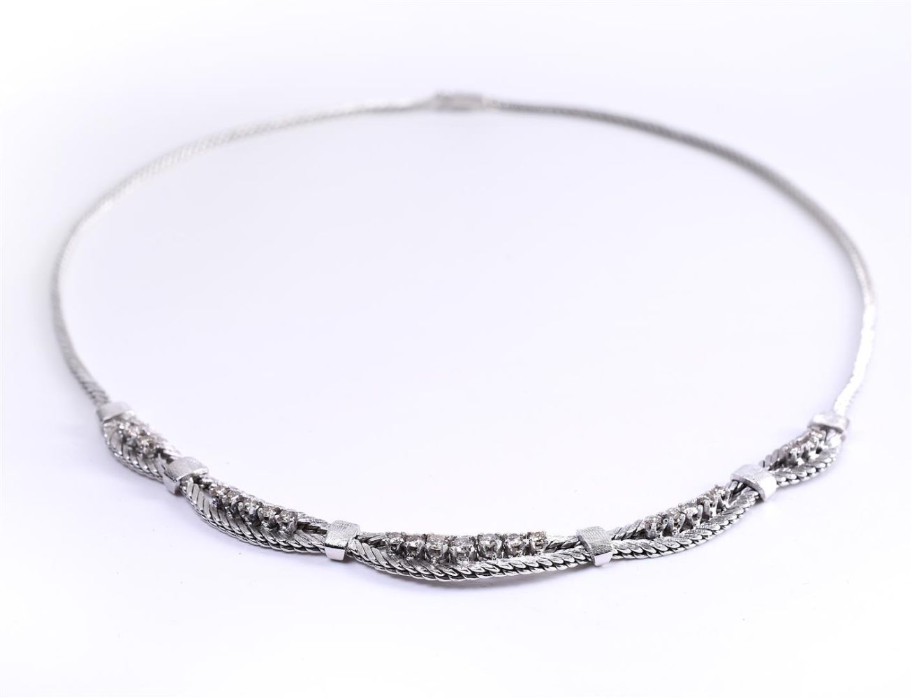 A white gold (14 kt) choker necklace set with 23 brilliant cut diamonds, including 12 of 0.04 ct, 5 of 0.07 ct, 2 of 0.05 ct, 2 of 0.06 ct, 1 of 0.08 ct, 1 of 0.10 ct. With a total of approx. 1.23 ct. with box clasp and safety catch. Diamond quality SI, color H-I.