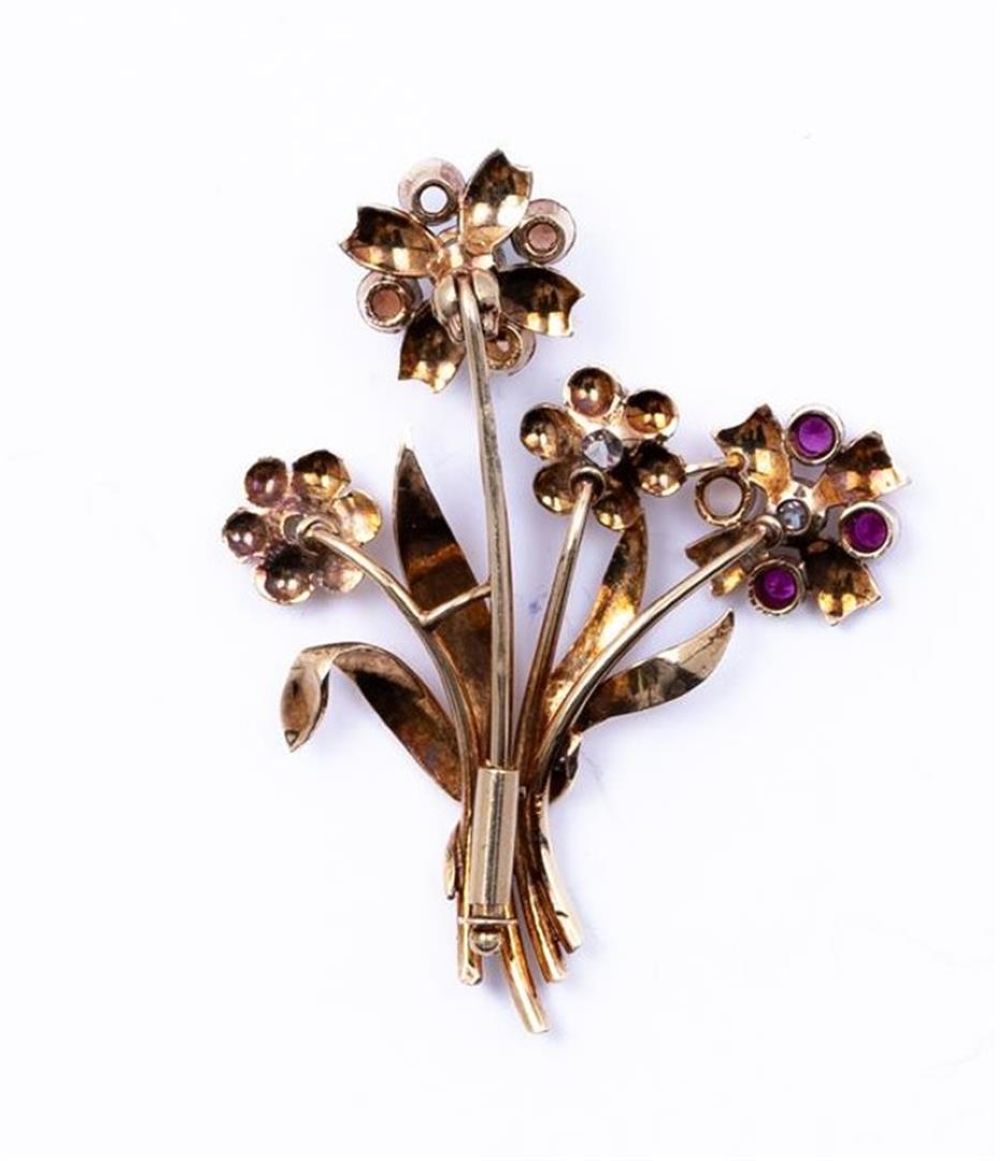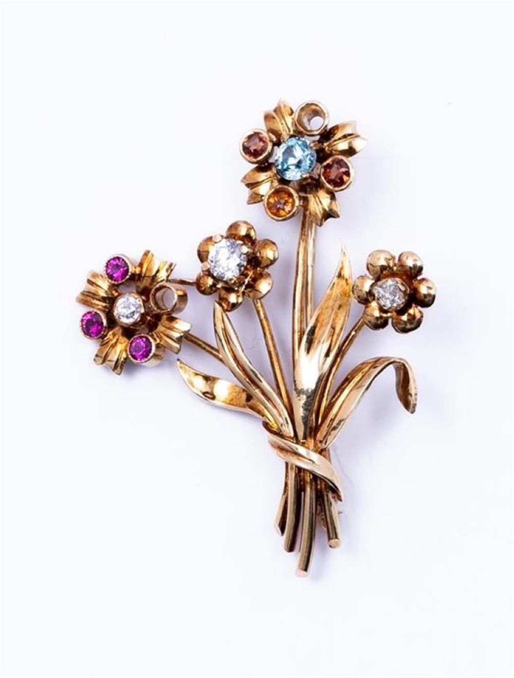 14kt Yellow gold Edwardian style brooch in the shape of a bouquet. The brooch is set with 2 old European cut diamonds of approx. 0.07ct. and 1 brilliant cut diamond of 0.20ct. and 1 old European cut aquamarine, 3 brilliant cut rubies and 1 brilliant cut ruby. and 4 old European cut orange citrine.