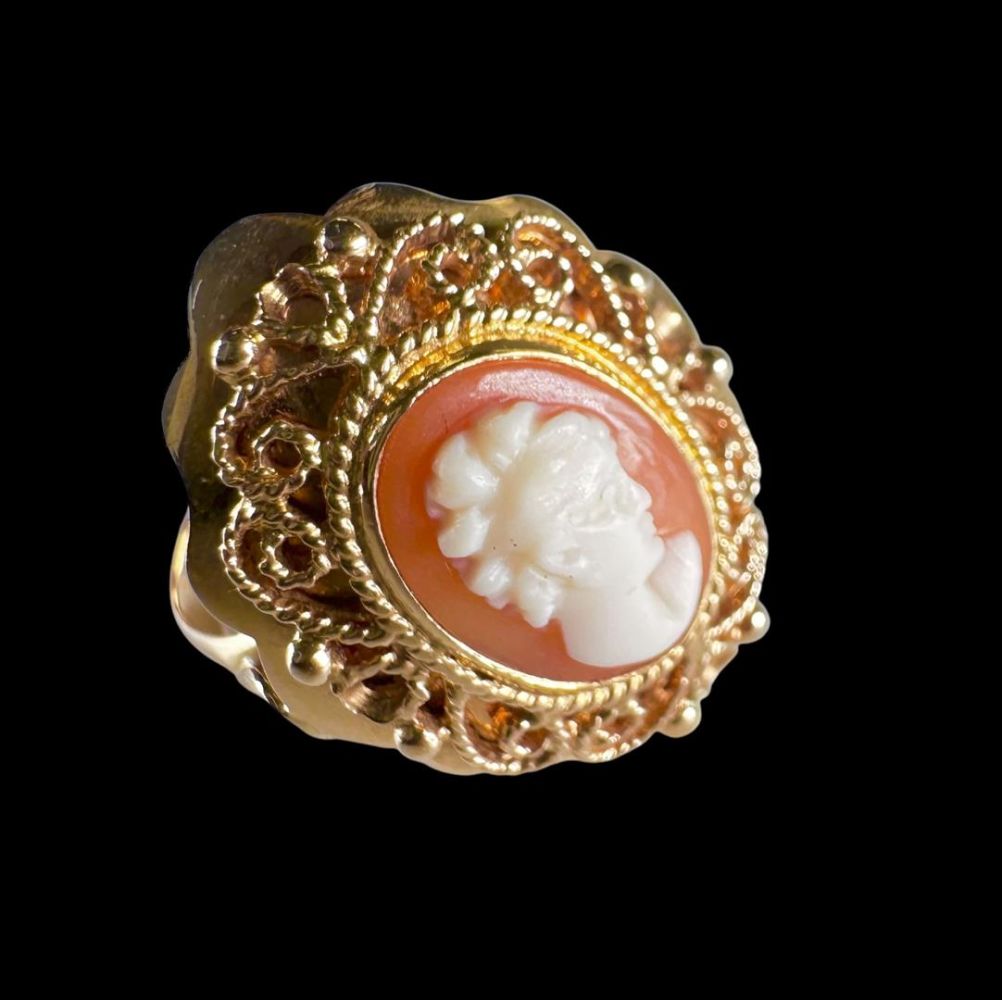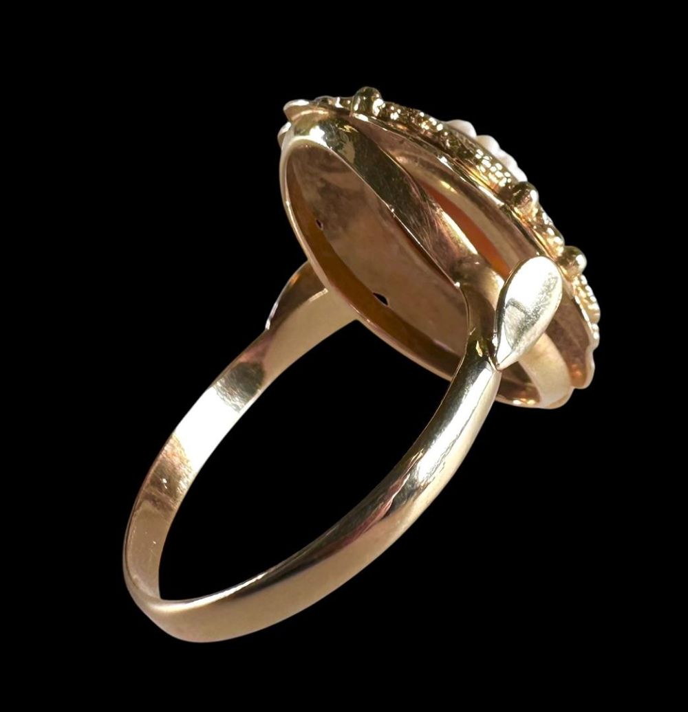 14kt yellow gold ring with twisted elements, set with an oval cameo.