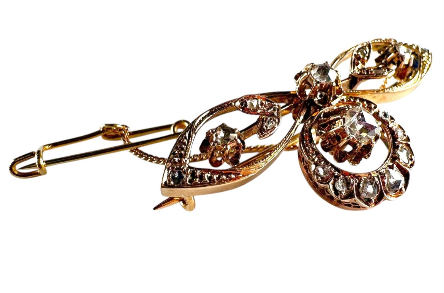 Antique yellow gold brooch set with 15 rose cut diamonds with an extra gourmet link safety chain and pin.