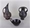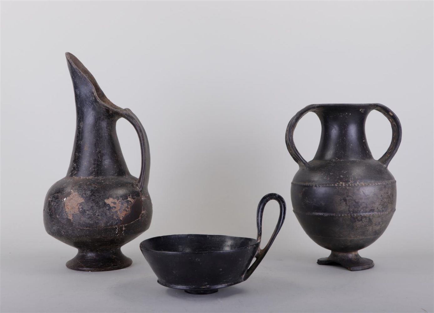A collection of Etruscan pottery consisting of an amphora, a jug and a bowl with handle. Possibly later.