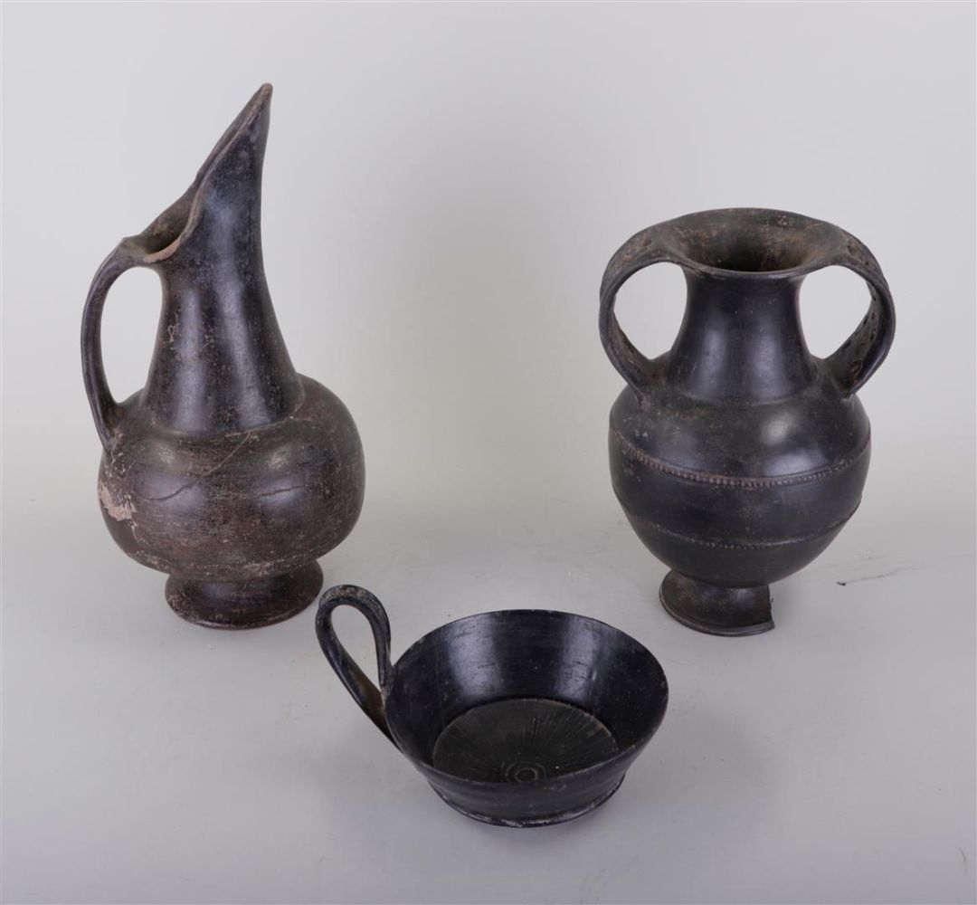 A collection of Etruscan pottery consisting of an amphora, a jug and a bowl...