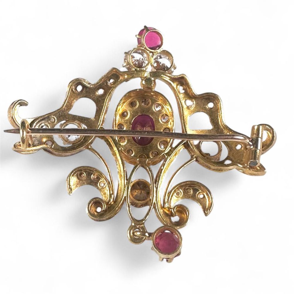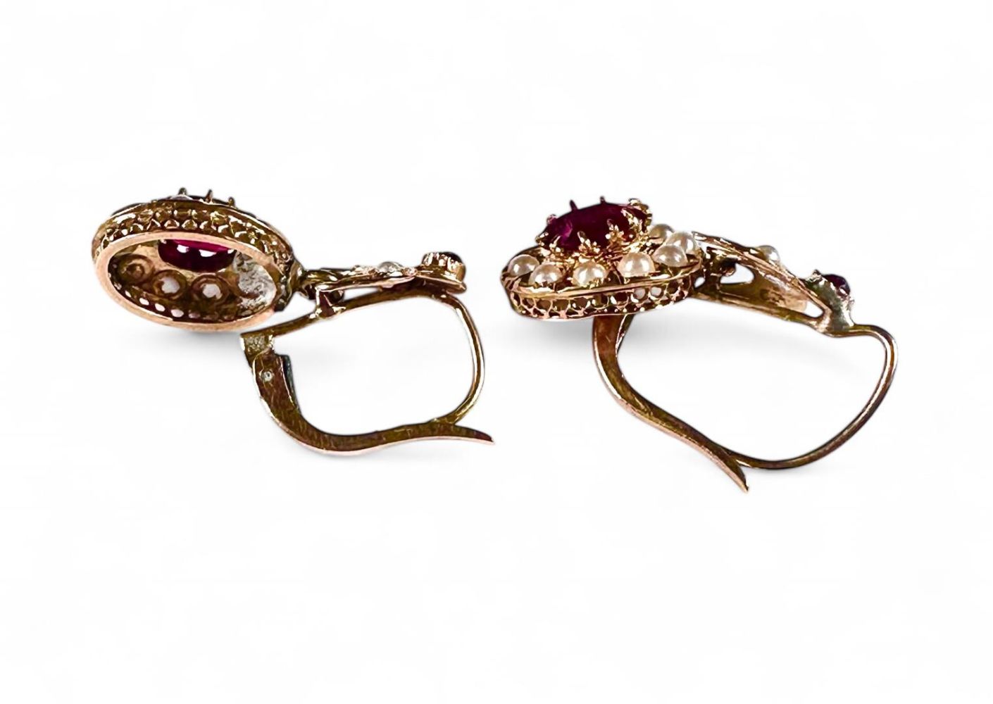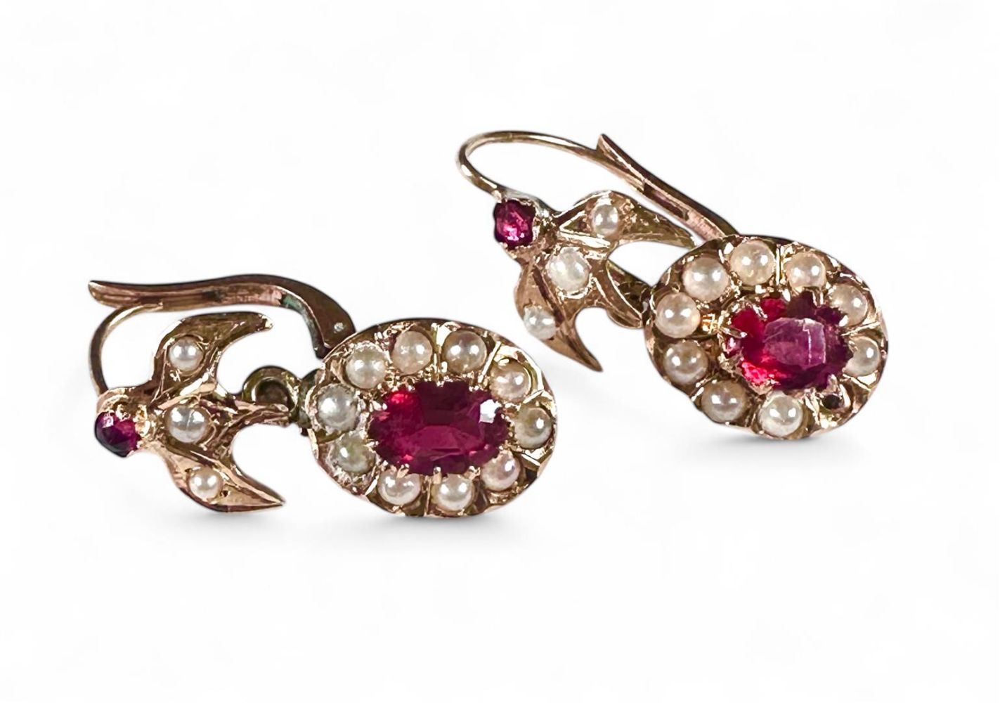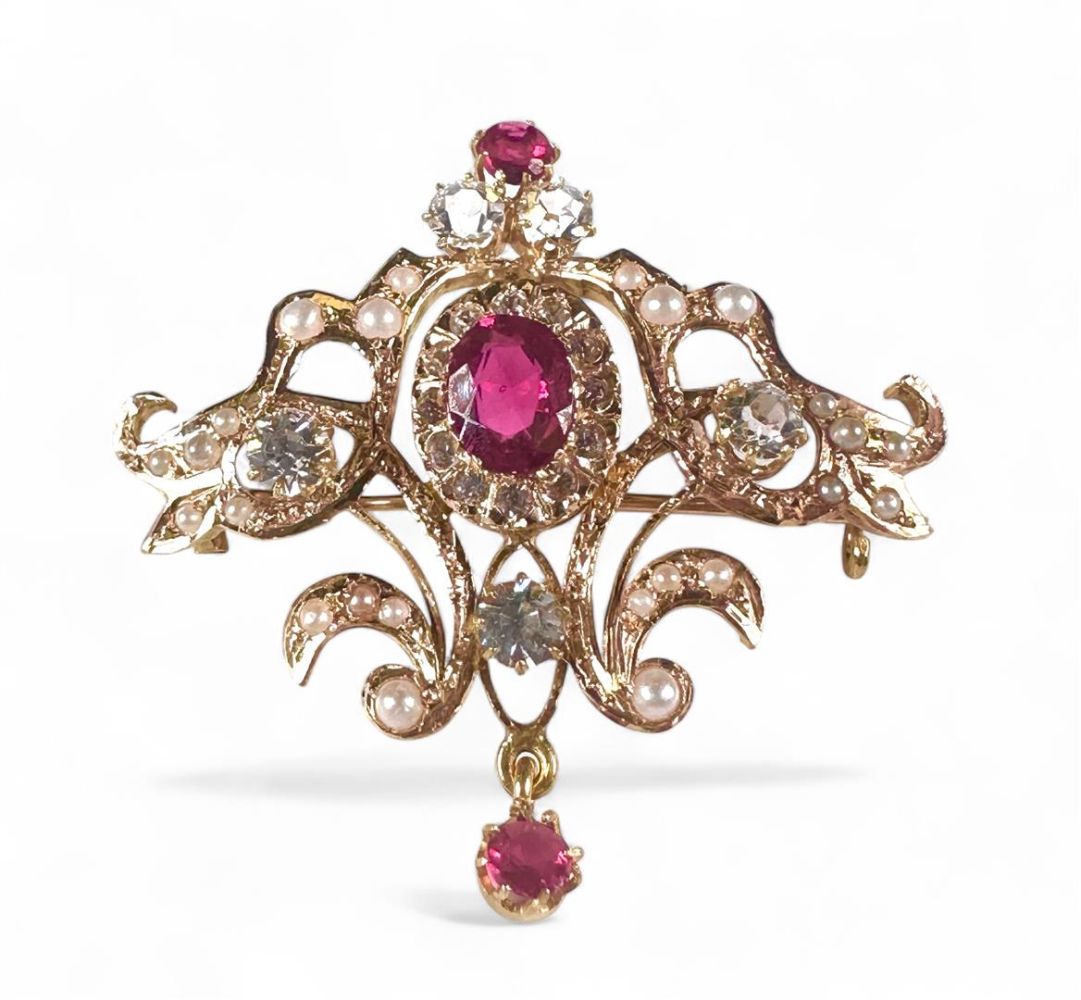 Both pieces of jewellery are set with seed pearls. Rosette cut, oval cut and old European cut red imitation rubies and single cut transparent imitation stones.