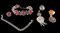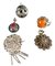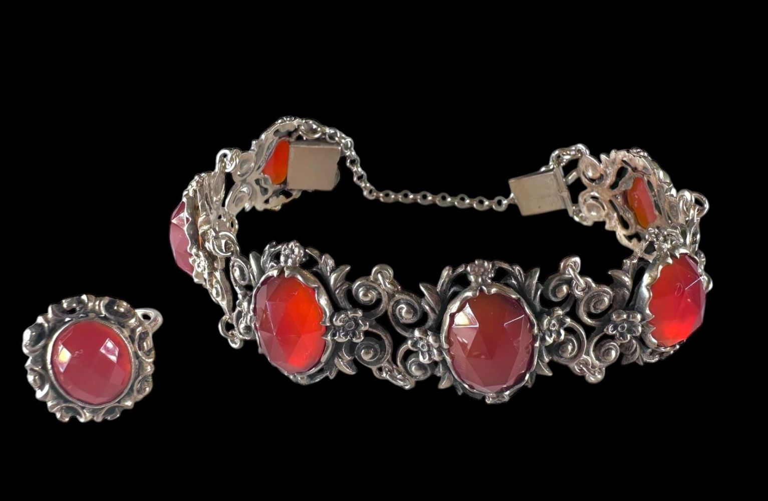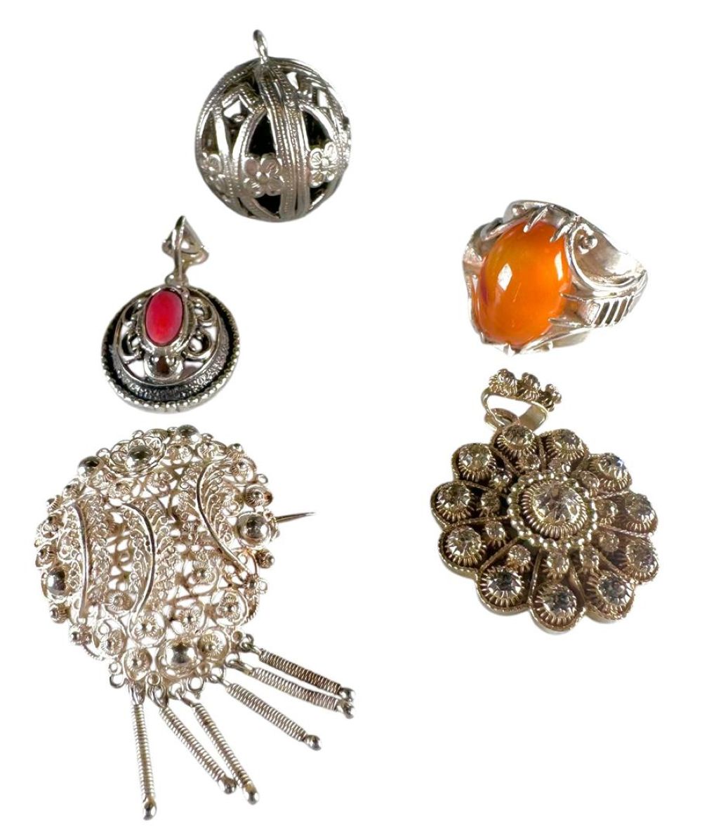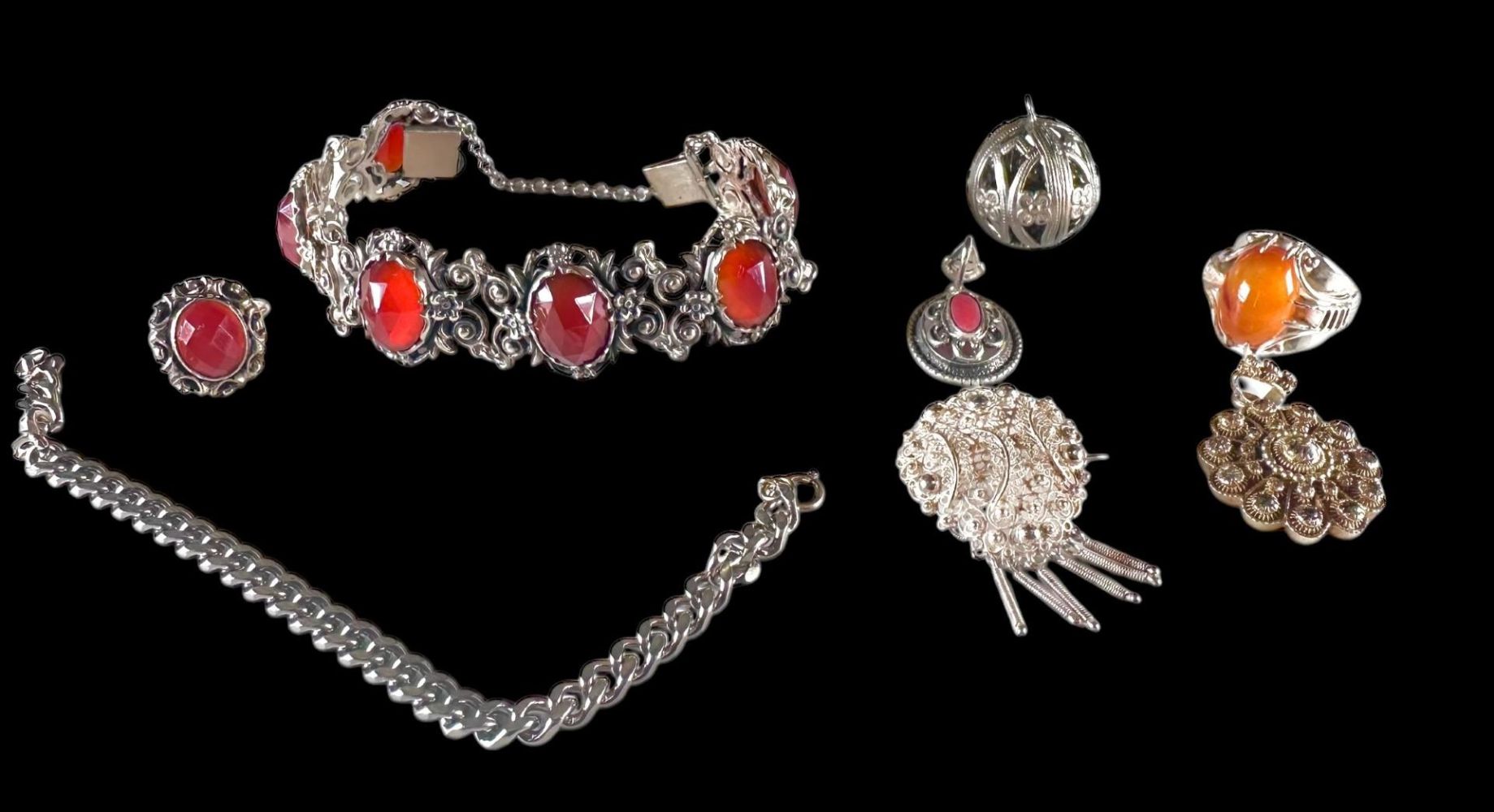 Lot with various jewelry, consisting of: A silver ring with cabochon cut amber, a silver filigree brooch with Zeeland buttons (consisting of 3 filigree feathers and 1 flower), a silver ring with scalloped edge and faceted oval carnelian, a silver oval pendant with cabochon cut red blood coral in Byzantine style, silver ball with animal hair, a silver pendant with stones in Zeeland button style, a silver gourmet link bracelet. and a fantasy link bracelet set with faceted carnelians.