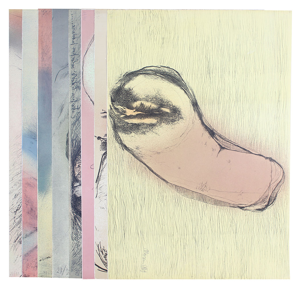 Moreni Mattia 4 probabili possibili… L'esibizionismo decadente di 4 vulve già sterili…, 1979 cartella contenente 8 litografie di 99 esemplari anche se alcune sono erroneamente contrassegnate con il numero 90, cm. 100x70 ogni copia reca a lapis la firma dell'autore e il numero della tiratura, eseguite dalla Stamperia Il Bisonte di Firenze su carta Magnani, tutte pubblicate sul catalogo presente all'interno della cartella
