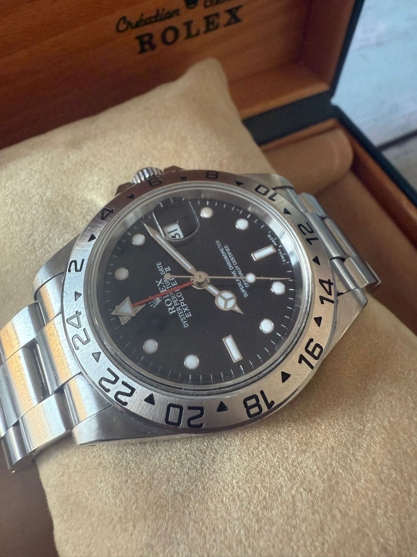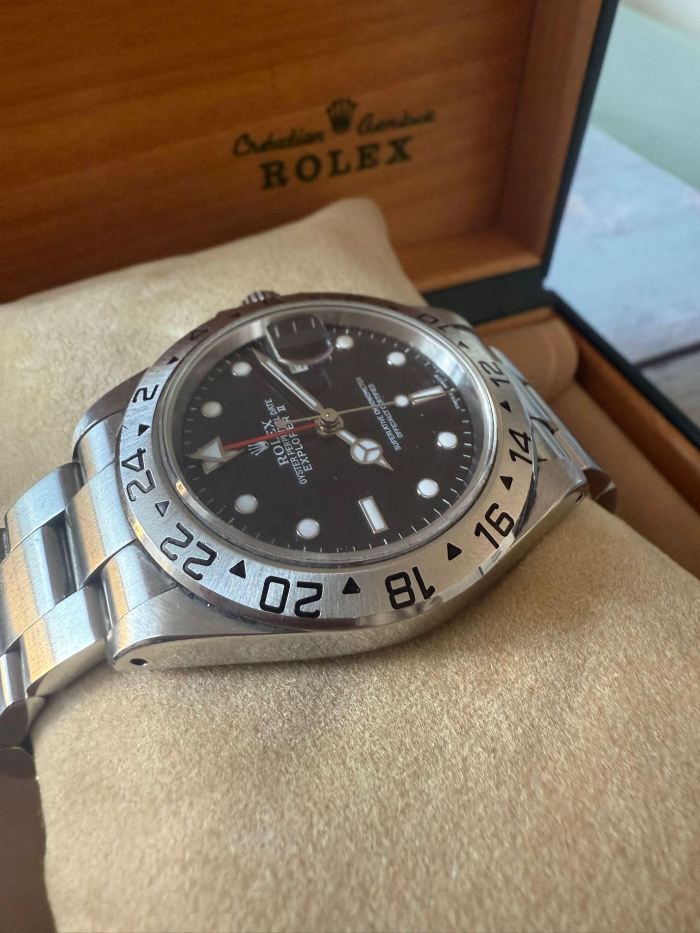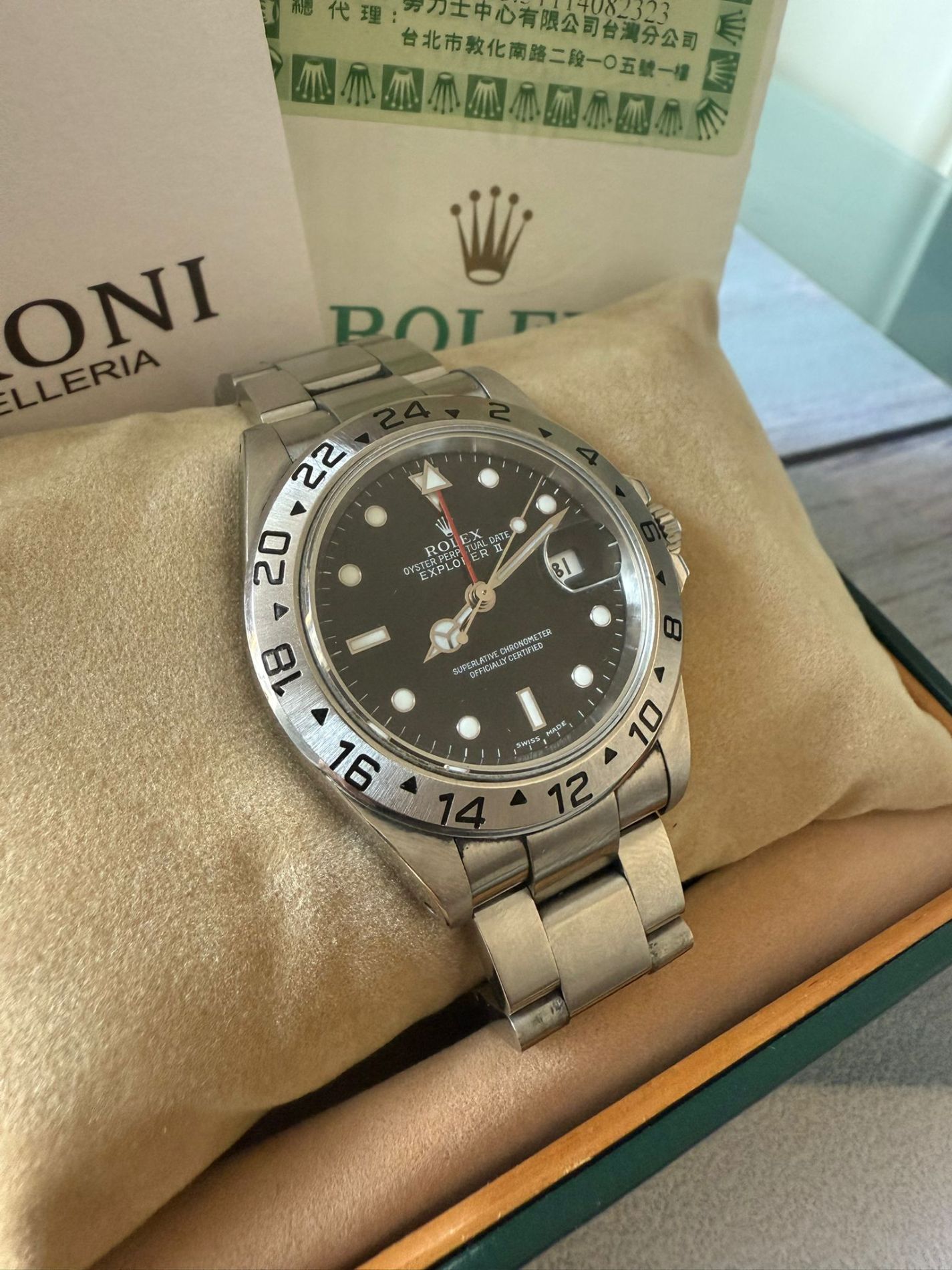Marca Rolex Modello (Orologio) Explorer II Numero di referenza 16570 Carica Automatico Materiale della cassa Acciaio Materiale cinturino Acciaio Corredo documenti originali Rolex, certificati di autenticità di Zironi, no box Calibro Carica Automatico Materiale della cassa Acciaio Diametro 40 mm Anni 2003 Impermeabile 10 ATM Materiale lunetta Acciaio Vetro Vetro zaffiro Quadrante nero Numeri sul quadrante Senza numeri Cinturino Materiale cinturino Acciaio Colore cinturino Acciaio Chiusura Déployante Materiale chiusura Acciaio