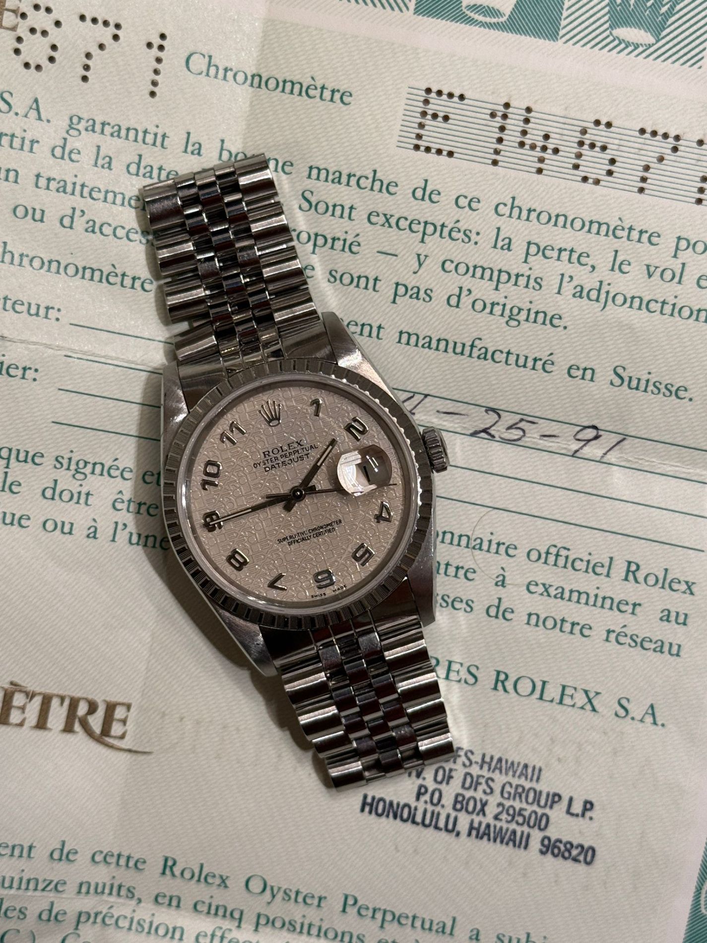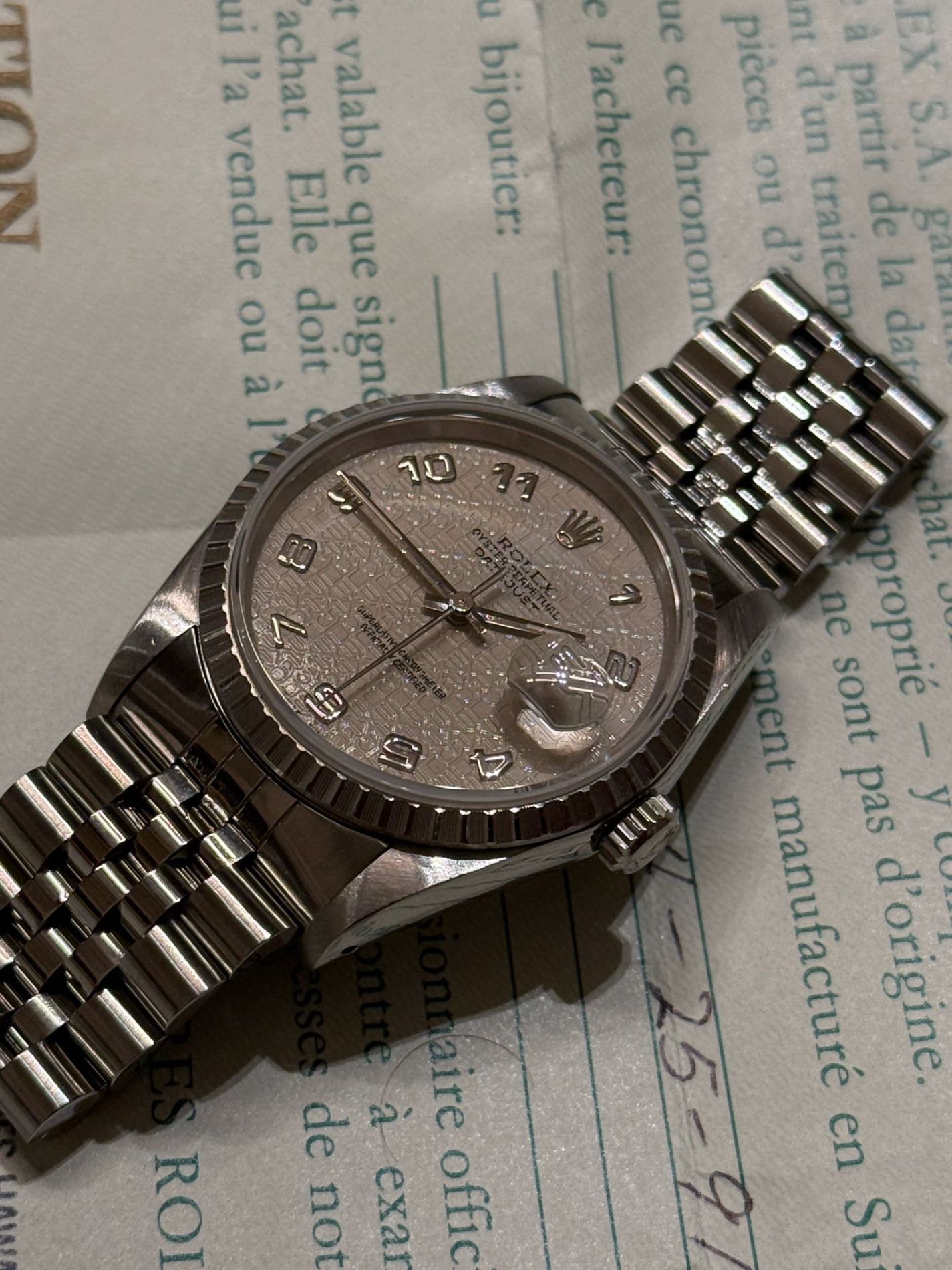 Marca Rolex Modello (Orologio) Datejust 36 Numero di referenza 16220 Carica Automatico Materiale della cassa Acciaio Materiale cinturino Acciaio Condizione Ottimo (di seconda mano, segni di usura assenti o appena visibili) Corredo Con documenti originali, senza scatola originale Calibro Carica Automatico Materiale della cassa Acciaio Diametro 36 mm Impermeabile 10 ATM Materiale lunetta Acciaio Vetro Vetro zaffiro Quadrante computer dial Cinturino Materiale cinturino Acciaio Colore cinturino Acciaio Chiusura Déployante Materiale chiusura Acciaio Funzioni Data