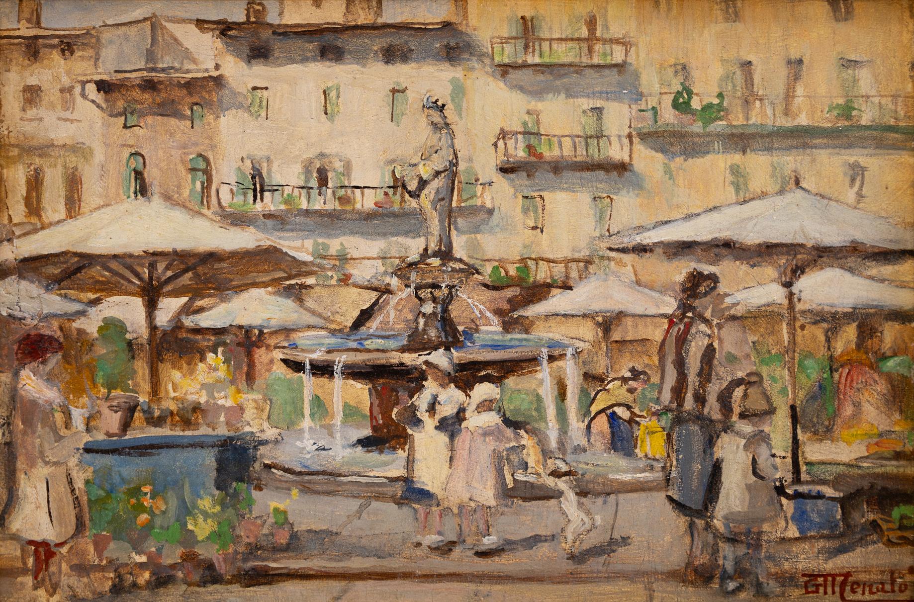 Giuseppe menato - Verona Piazza delle Erbe 1919 - Bovolone VE 1874 - Verona 1962 - Olio su tavola cm 26,5x38