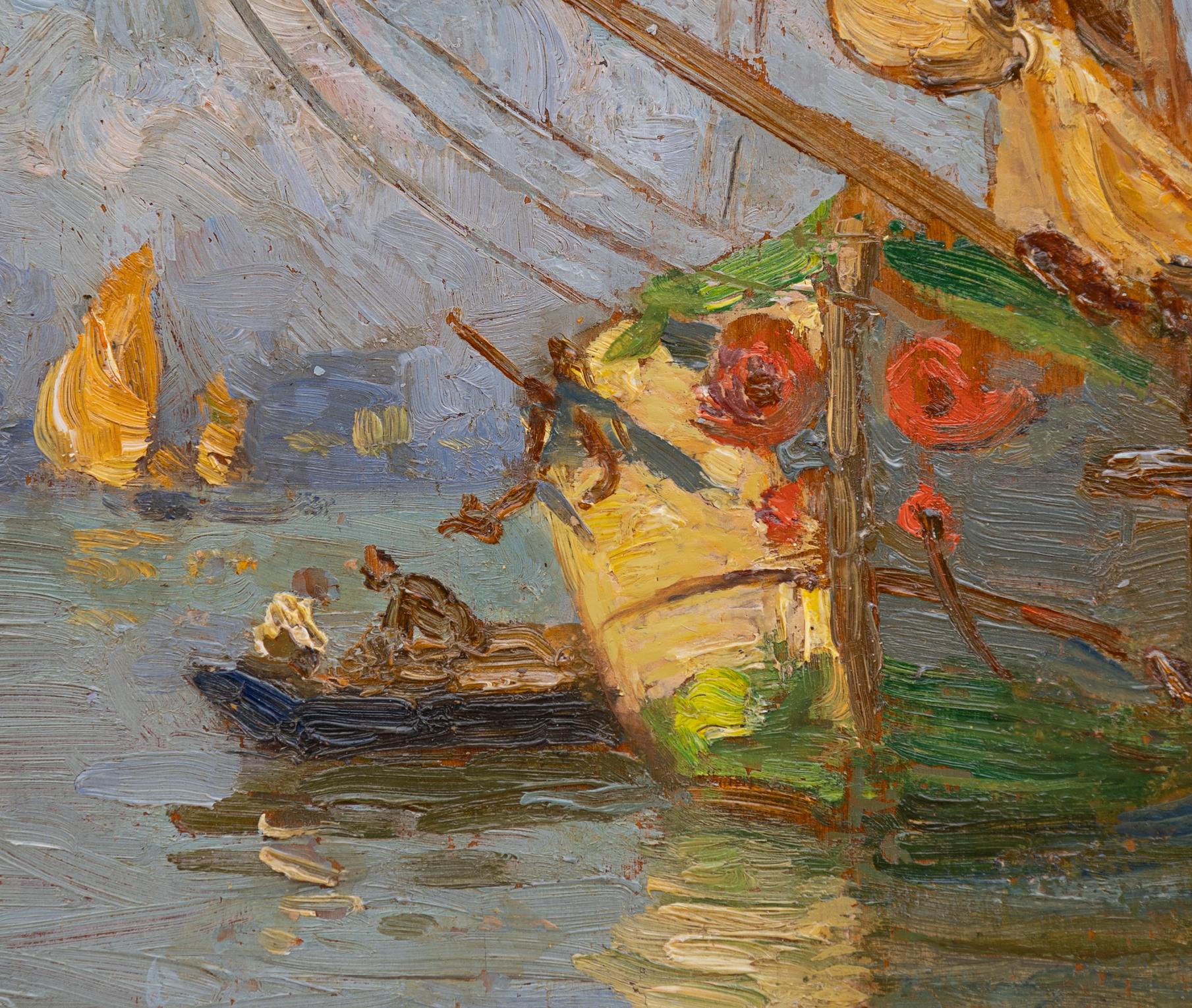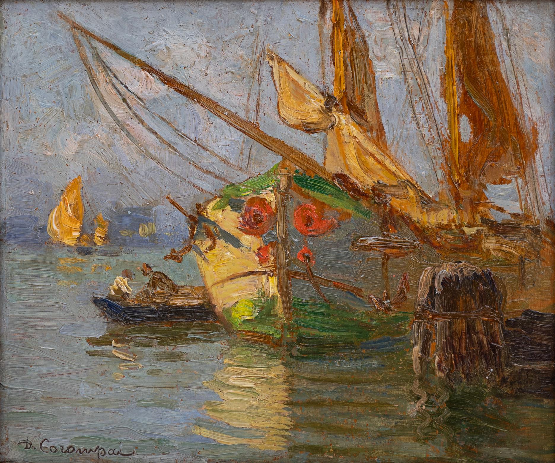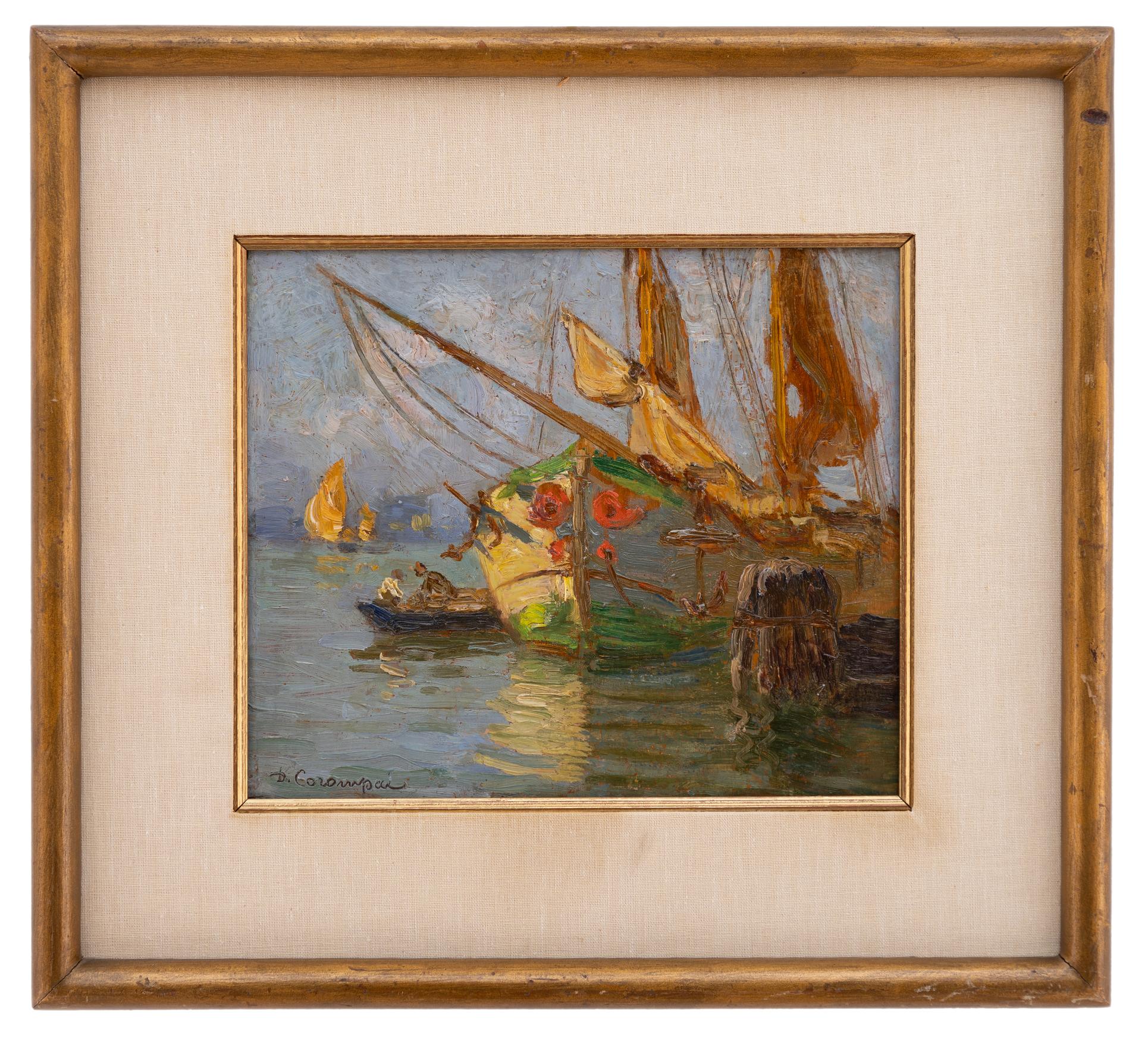Duilio Corompai - Nel Porto - Venezia 1876 - Noventa Vicentina (VI) 1952 - Olio su tavola cm 21x25