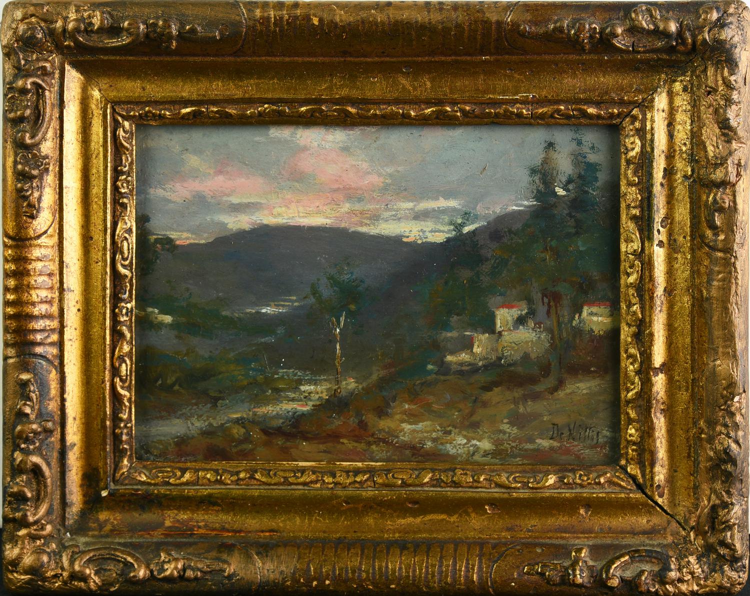 Giuseppe De Nittis, (1846 - 1884) ALLE FALDE DEL VESUVIO olio su cartone, cm...