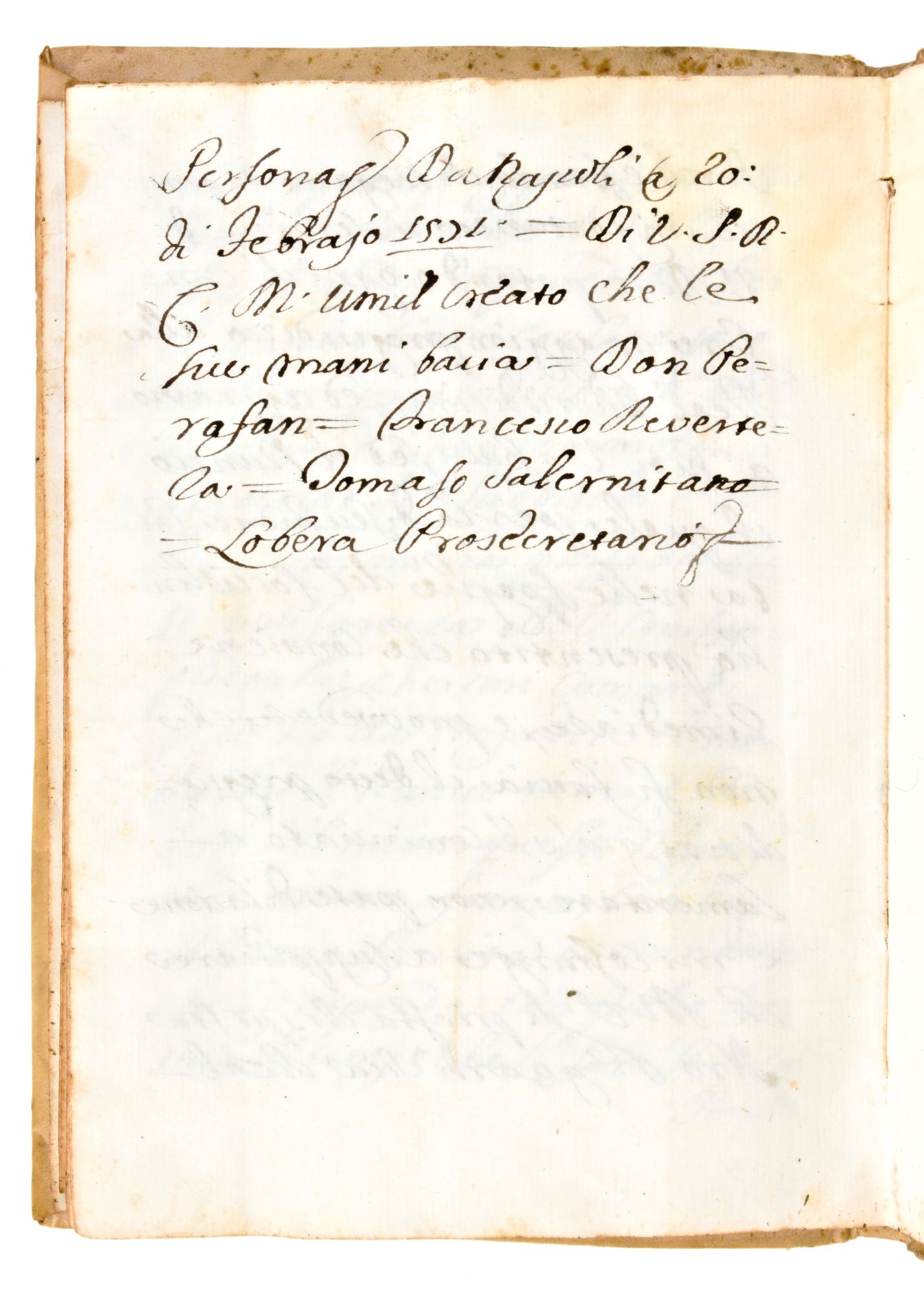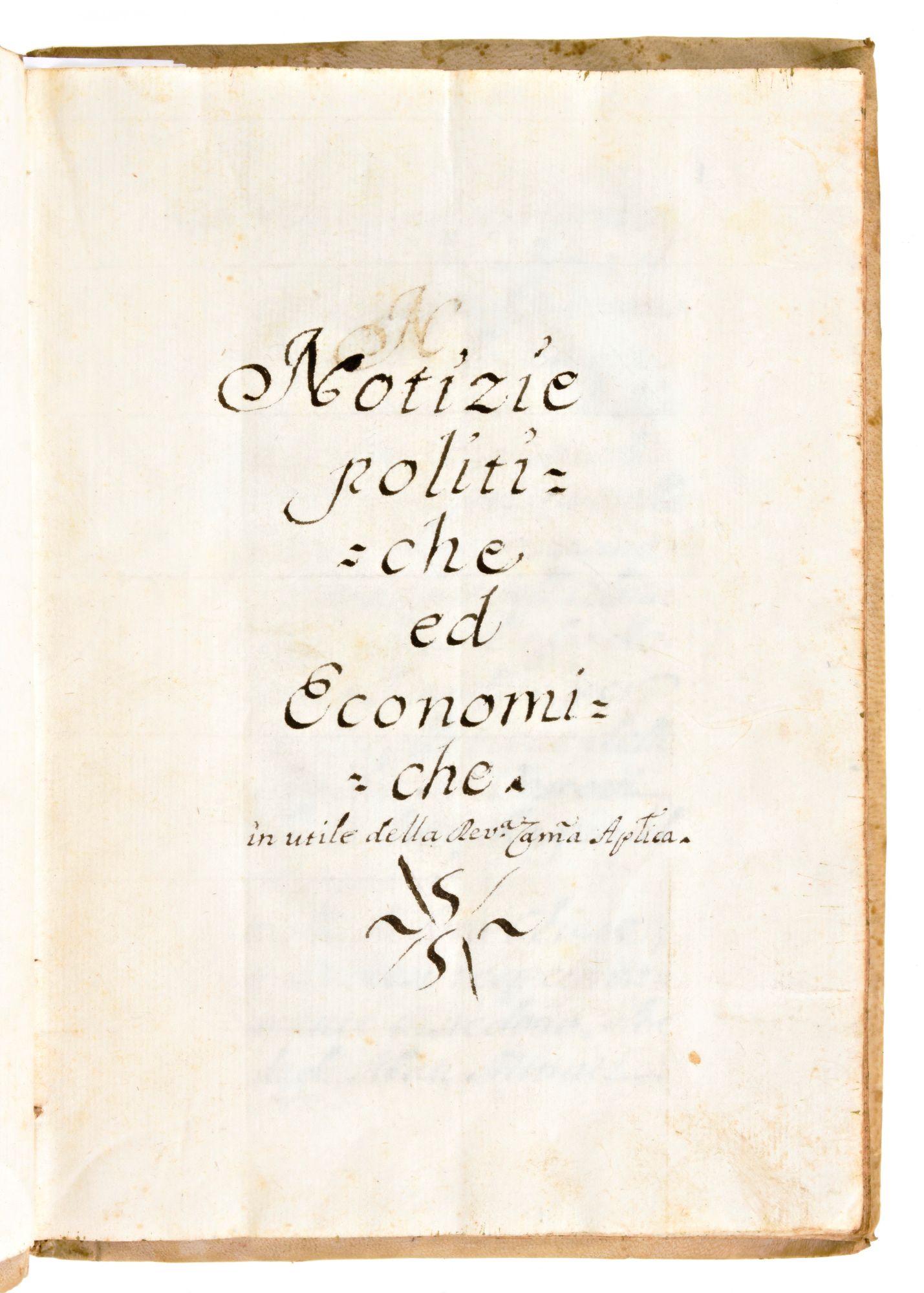In-8°, mm. 225x160, carte 65 (numerazione manoscritta). Rilegatura coeva in piena pergamena con titoli manoscritti al dorso. Leggero alone al margine superiore del testo. Lievi difetti e segni del tempo. Antico manoscritto databile circa 1750 con le notizie politiche ed economiche riguardanti la Nunziatura Apostolica a Napoli (rappresentanza diplomatica permanente della Santa Sede nel Regno di Napoli). Testo italiano & spagnolo.