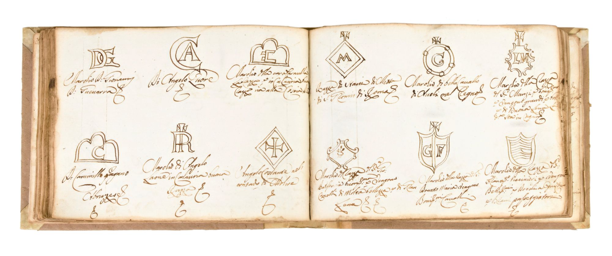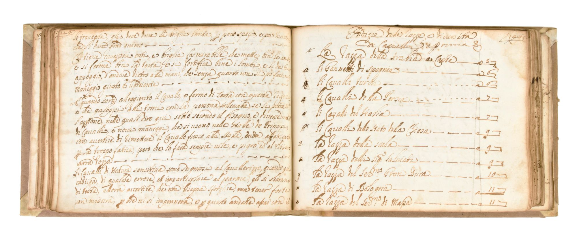 [ MANOSCRITTI / EQUITAZIONE ]" Manoscritto Discorso sopra i Cavalli, Mali d’essi e Modo di Imparare a Cavalcare "Meraviglioso manoscritto illustrato dal titolo “Discorso sopra i cavalli, mali d’essi e modo di imparare a cavalcare”.Pur non essendo presenti riferimenti sull’autore e la datazione, possiamo far risalire il prezioso manoscritto tra la fine del XVII e l’inizio del XVIII secolo. Confrontando l’incipit presente a pagina 5 “1 Ciascheduno sa, che tutte le cose di questo Mondo furono create per il comodo, e servizio del’homo…” possiamo comprendere come il testo sia estrapolato dalla Mascalcia Toscana, fondamentale opera di Vincenzo Ferri.Non è chiaro infatti se questa opera sia realmente stata completata poiché vi è un salto nella pagina 144 precedente all’indice (che non termina) ed in relazione all’opera del Ferri sono presenti alcune variazioni e la compilazione dello stesso indice si interrompe a pagina 115 con una grafia differente e presumibilmente apposta in un secondo momento. Sono contenute nel testo tutte le razze e le diversità dei cavalli conosciuti, l’elenco delle cure per tutti i mali che possono affliggere gli equini ed infine i vari stili di equitazione, divisi e numerati. A rendere davvero speciale il manoscritto è la presenza di una seconda parte, redatta dalla stessa mano, che racchiude tutti i marchi delle principali razze di cavalli d'Europa, concentrandosi specialmente su realtà italiane, come ad esempio i cavalli dell’Imperatore Ferdinando di casa d’Austria o di Boemia, del Granduca di Toscana, del Re di Napoli e centinaia di altri.Sono raccolte infatti in 139 pagine ben 834 marchi finemente ornati e descritti nei minimi dettagli che rendono il manoscritto unico.Il manoscritto, redatto in chiara grafia in formato oblungo e rilegato in mezza pergamena, è così composto: 153 pagine manoscritte nella prima parte e 139 pagine manoscritte nella seconda parte. Parziale gora che non compromette la consultazione; altissima rarità.